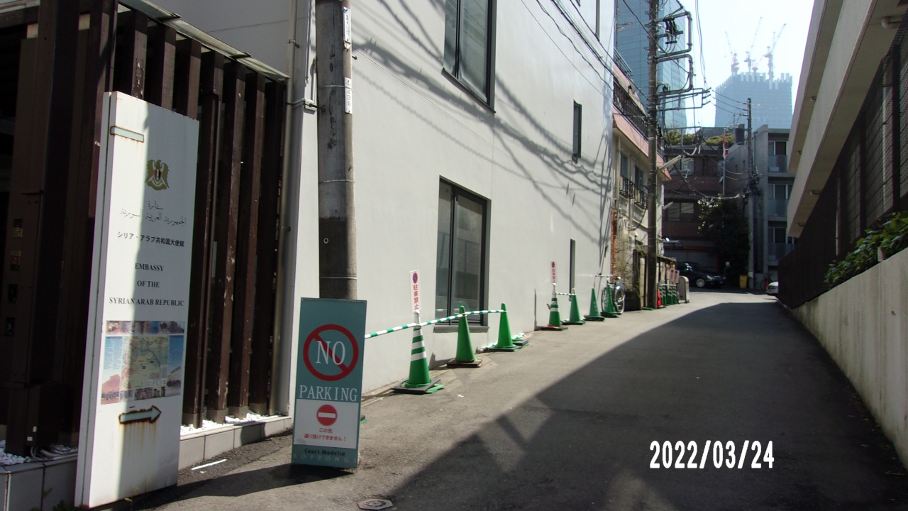 このシリア・アラブ共和国大使館は檜町公園の近くにあります。地下鉄都営大江戸線六本木駅から北東に10分程度の場所にあります。この大使館は塀がありません。ビルがそのまま大使館です。ただ入り口の太い鉄扉が印象的です。住宅街の一角にあります。入り口も横道です。大使館としては質素です。