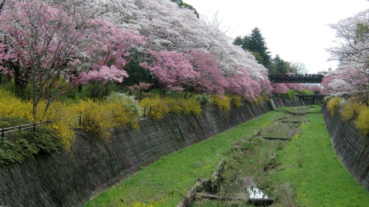 中流にあたる国営昭和記念公園内の両岸に桜並木がある場所が最大の見せ場で、4月の花見どきは見事にピンクに染まる。薄いピンクのソメイヨシノに加え、濃いピンクの陽光などが競い合って咲く様は、見事というしかない。