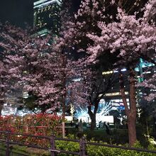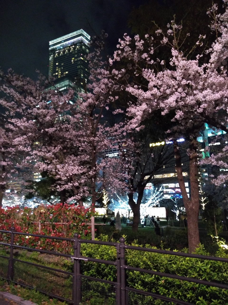 あべのハルカスからは桜を満足に眺めることはできませんが、天王寺公園のてんしばエリアからはあべのハルカスを満開の桜とともに眺められました。夕方が順光ですが、夜でも眺めることは可能です。ただし、桜を対象にしたライトアップはありません。