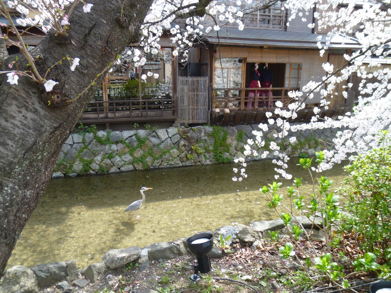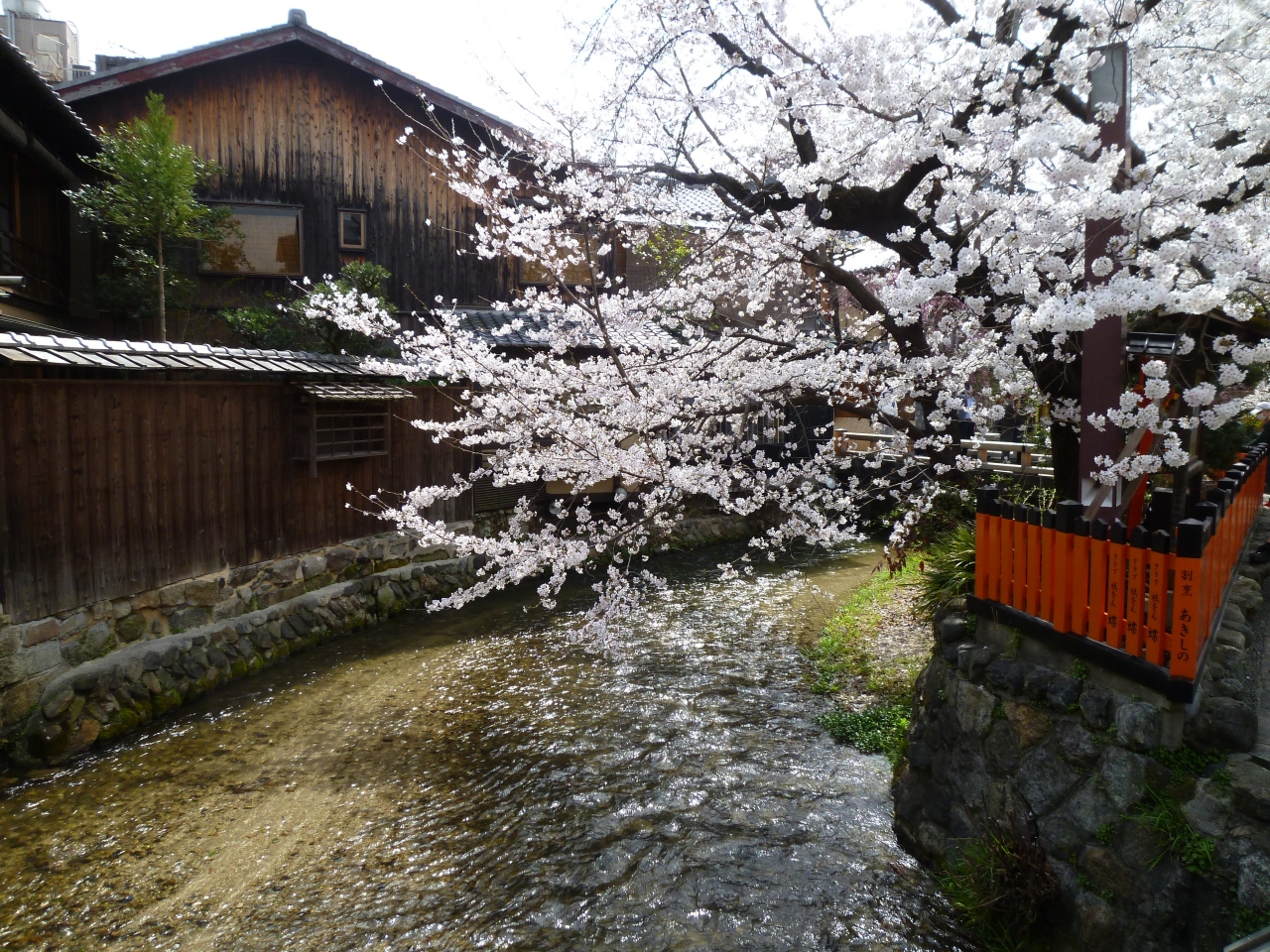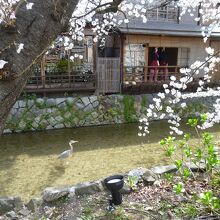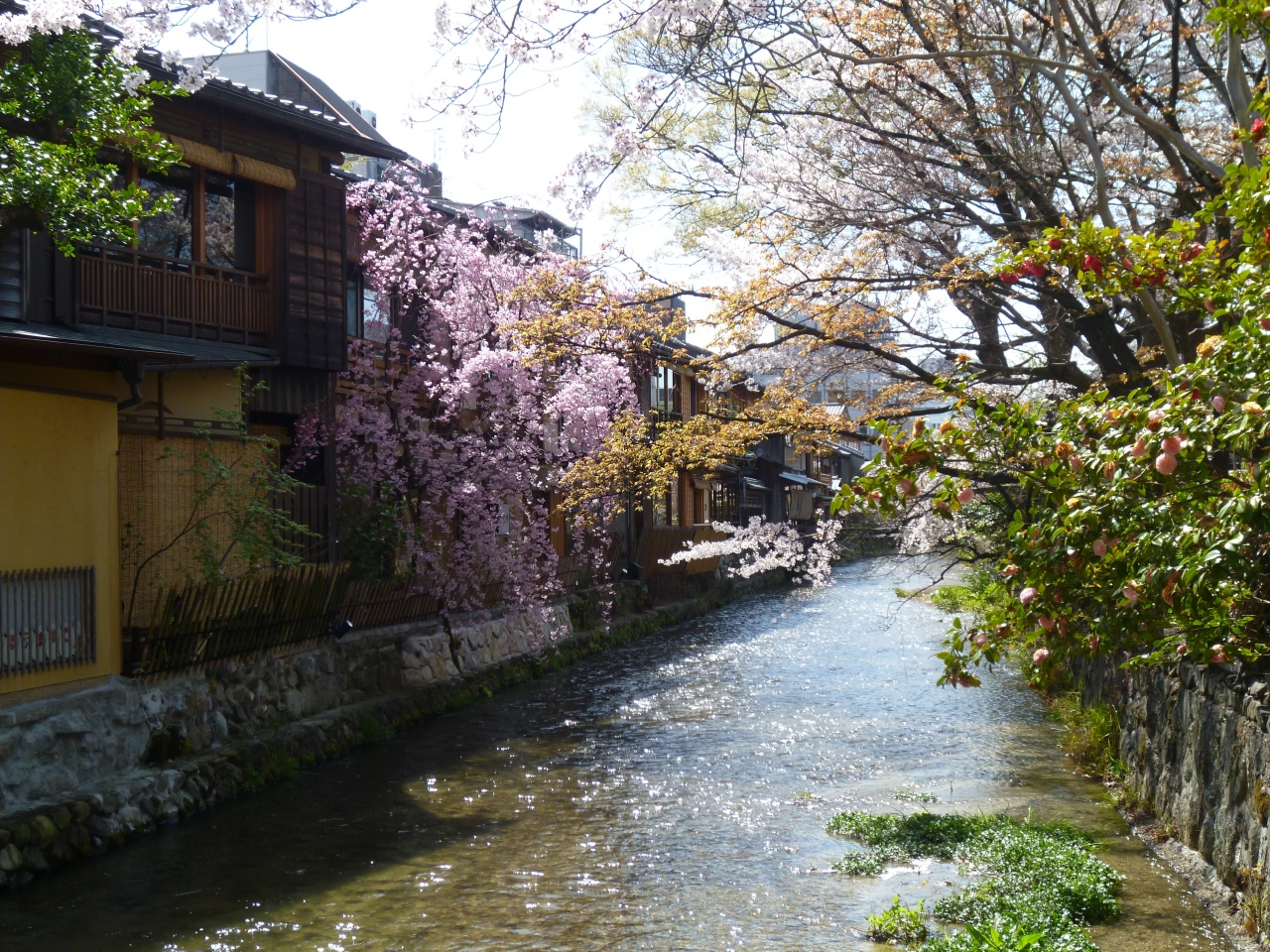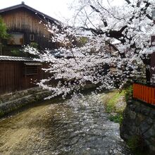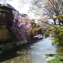 花見小路を進んだ先にある白川と新橋通に面する通りを「祇園白川」と呼んでいます。京都の情緒を楽しむには一番のスポットとなっています。時には偶然、舞妓さんや芸子さんの姿が目にすることもある場所です。しばしば、テレビドラマなどで、この付近が撮影に使用されていることもあります。白川に沿って桜がきれいに咲き、春の観光シーズンにはとても多くの人々が訪れる名所となっています。白川の緩やかで清らかなせせらぎ、そこで餌を求めているサギ、傍に佇む料亭、白川にかかる巽橋、辰巳大明神など見どころも多く、京都らしい風情が感じられる場所でおすすめできます。