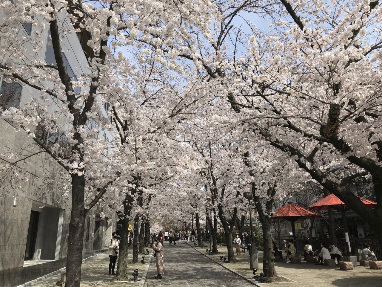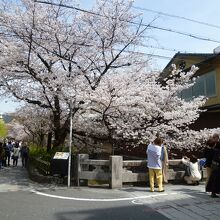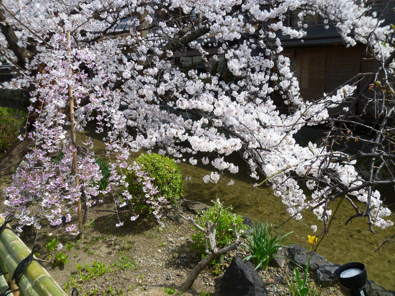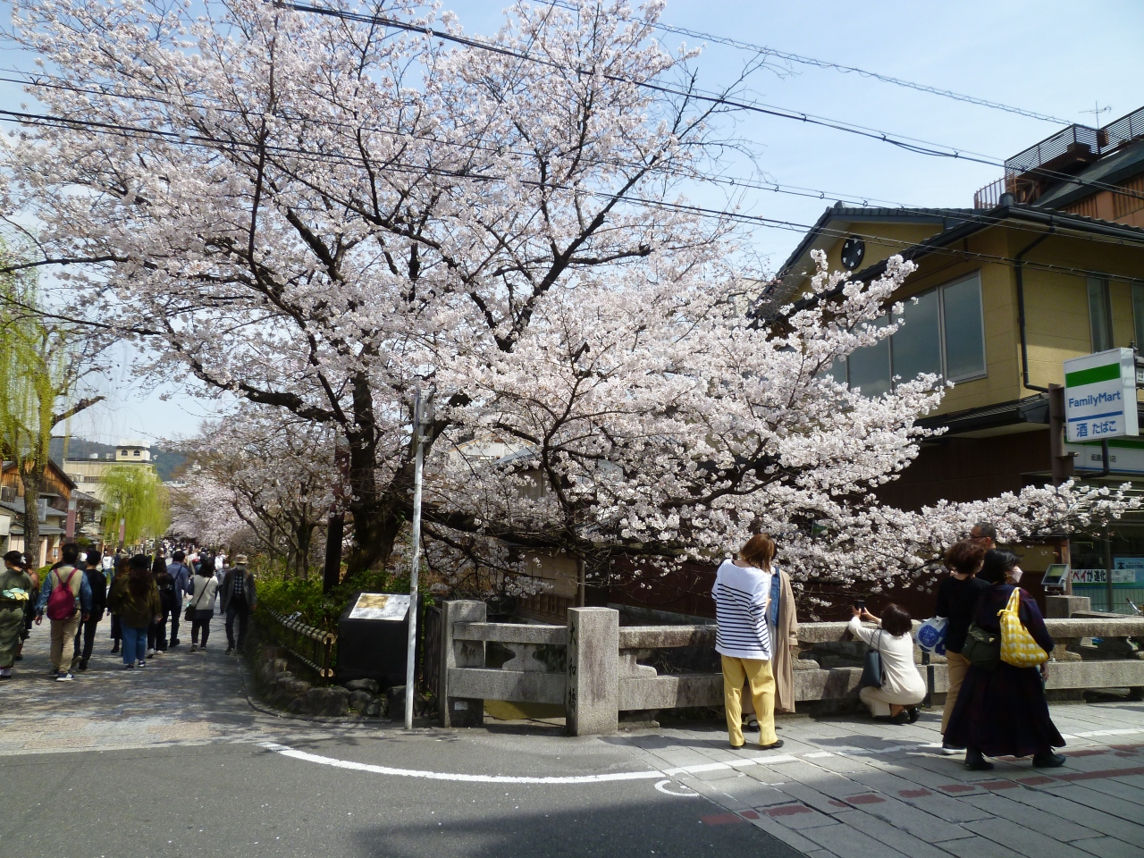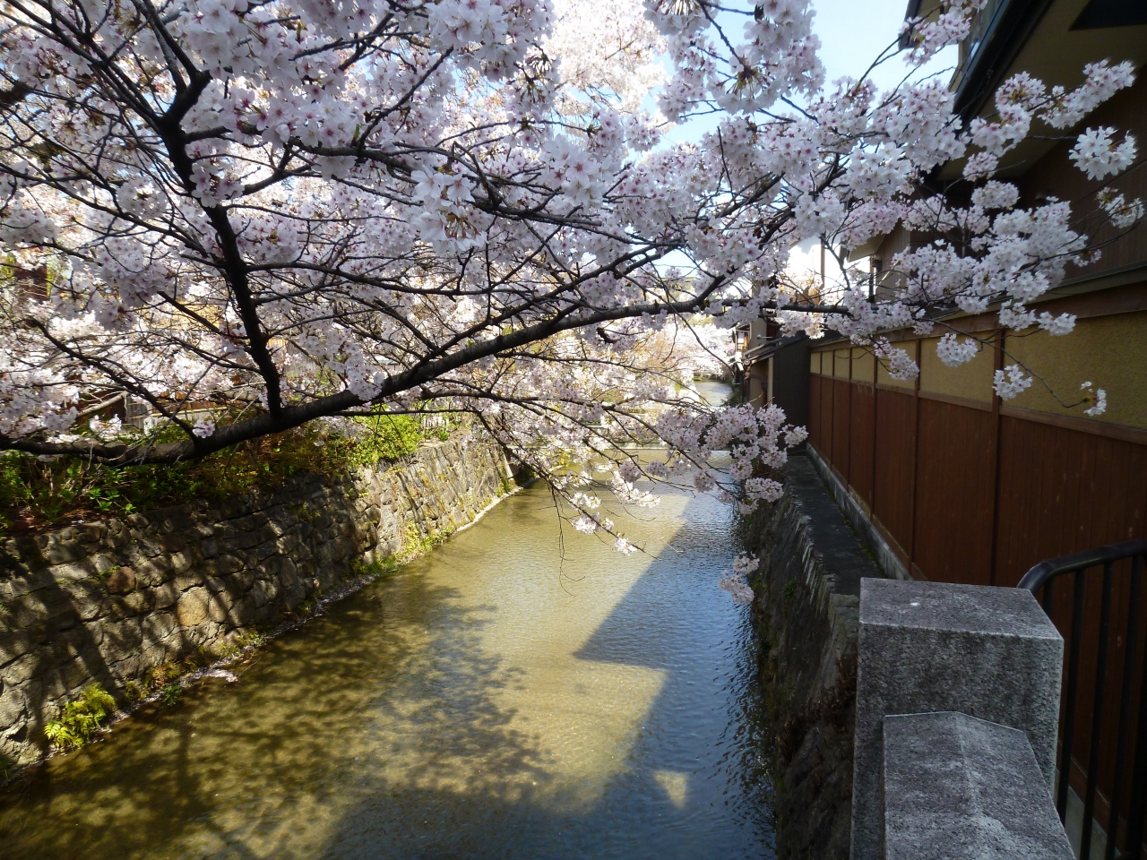 花見小路を進んだ先にある白川と新橋通に面する通りを「祇園白川」と呼んでいます。京都の情緒を楽しむには一番のスポットとなっています。時には偶然、舞妓さんや芸子さんの姿が目にすることもある場所です。しばしば、テレビドラマなどで、この付近が撮影に使用されていることもあります。白川に沿って桜がきれいに咲き、春の観光シーズンにはとても多くの人々が訪れる名所となっています。白川の緩やかで清らかなせせらぎ、そこで餌を求めているサギ、傍に佇む料亭、白川にかかる巽橋、辰巳大明神など見どころも多く、京都らしい風情が感じられる場所でおすすめできます。