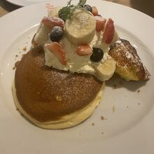 パンケーキとフレンチトーストのセットをいただきました。パンケーキは、程よいふわふわ系で、フレンチトーストもしっとりしており、おいしくいただけました。大きいというほどのサイズではないので、食べやすく、種類も多かったです。