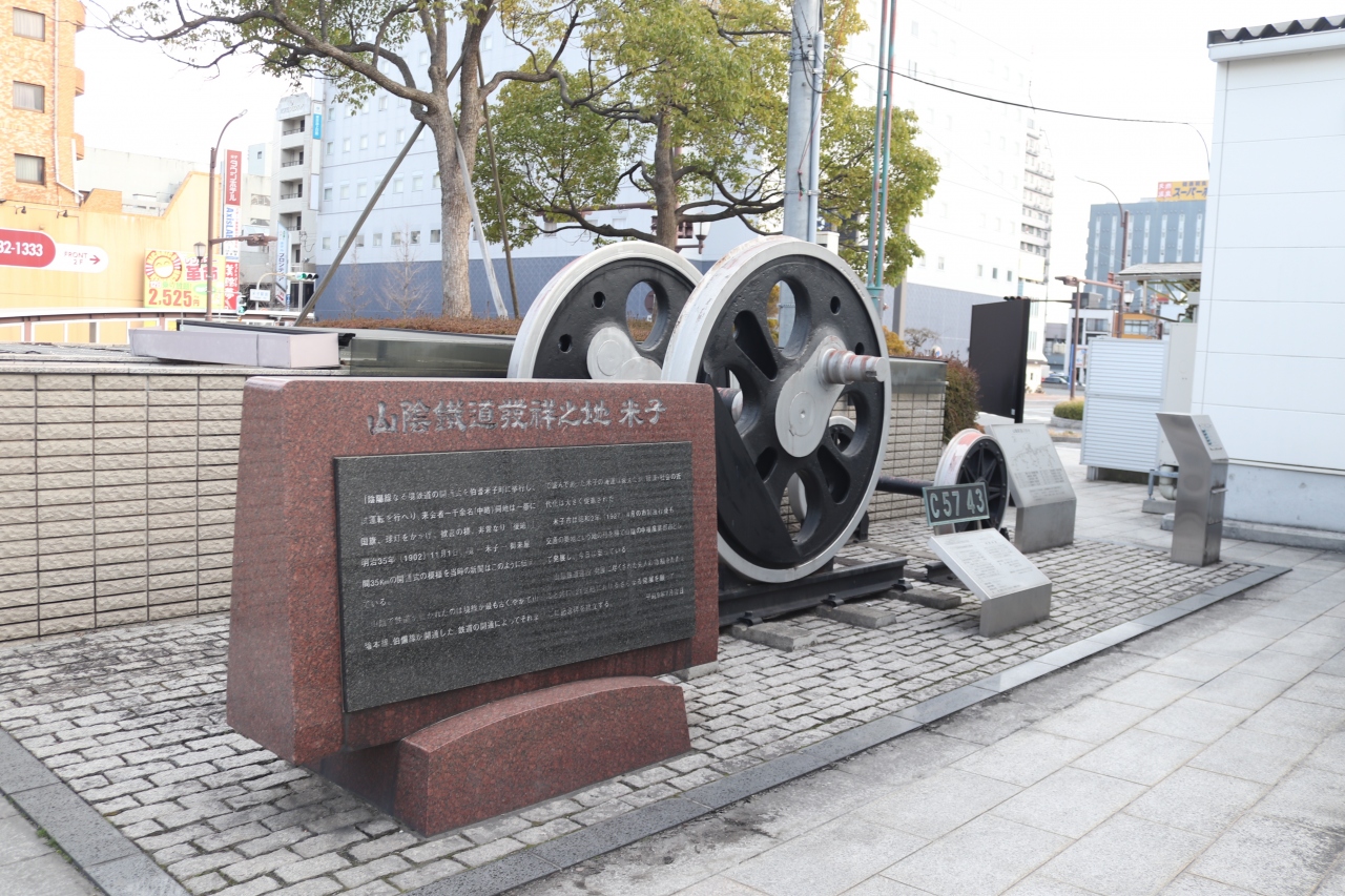 米子駅前にある記念碑です。今は駅前が工事でちょっとわかりにくい場所にあります。蒸気機関車の動輪と客車の車輪のモニュメント、「山陰鉄道発祥之地」とかかれた碑があります。昔も今で米子は鉄道の要衝です。だんだん広場には、銀河鉄道999を思わせるモニュメントもあります。