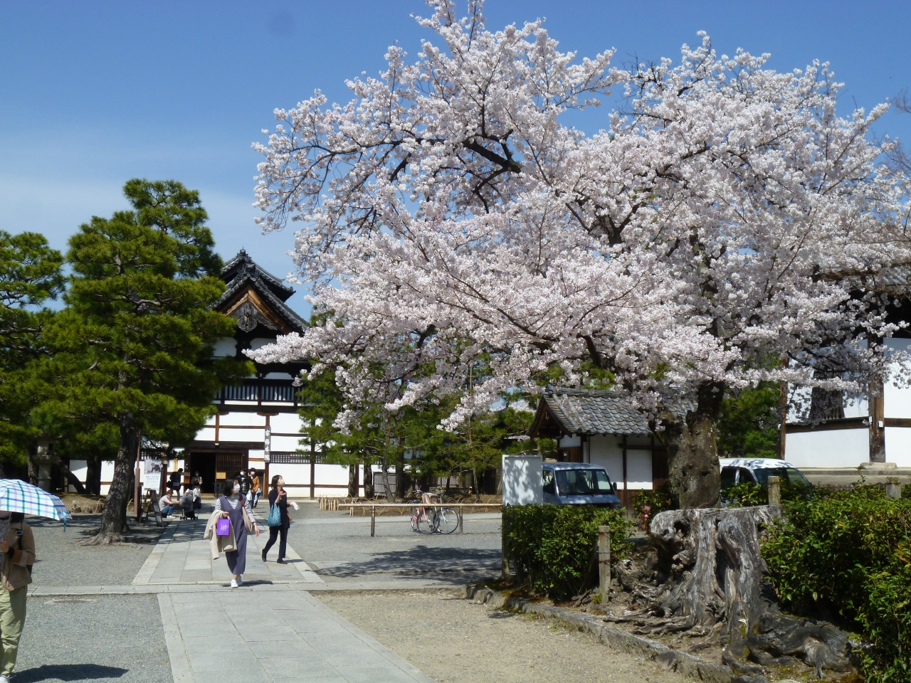 建仁寺は、京都五山のなかのひとつ、第3位に列せられる京都最古の禅寺です。京都市街地にあって広大な敷地を有しています。春の観光とで花見小路から建仁寺に向かうと山門と駐車場付近に咲いているソノイヨシノに目を奪われました。このお寺は花見寺ではありませんが、ここにとてもきれいな桜があることを初めて知りました。訪れた方も記念撮影を楽しんでいました。境内を散策してみると多くはありませんが、桜の木々があり、たのしむことができました。