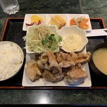 酒田市港湾合同庁舎の向かいにあるラーメン&定食の店です。一人でランチに入りました。チキン南蛮定食(800円)をいただきます。チキン唐揚げにタルタルソースを絡めて、密かな甘さが美味しいです。チキンの量が大盛りなのも嬉しいところです。