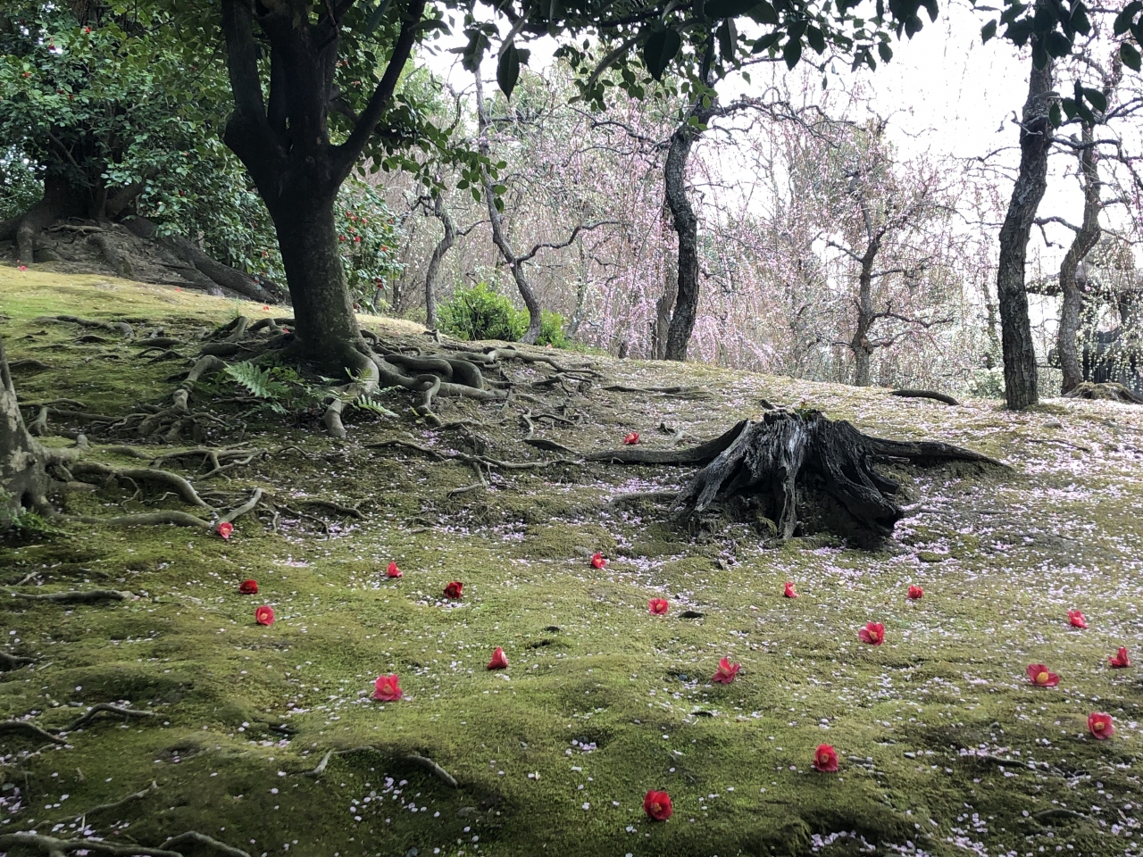 城南宮のしだれ梅を見に3月の中旬に行きました。神苑の入場料800円を払い入園。社殿の西に広がる「春の山」では、150本のしだれ梅が見ごろというより、やや散り始めていましたが「花びらの絨毯」を楽しめました。それと、神苑入口から春の山、さらに平安の庭にかけては120品種・約400本の椿が次々に花開きます。”しだれ梅と落ち椿”の景色は格別です。