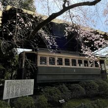 はいってすぐの桜の山を過ぎ、平安の苑のエリアの奥になんともレトロな電車がおいてあっておどろきました。