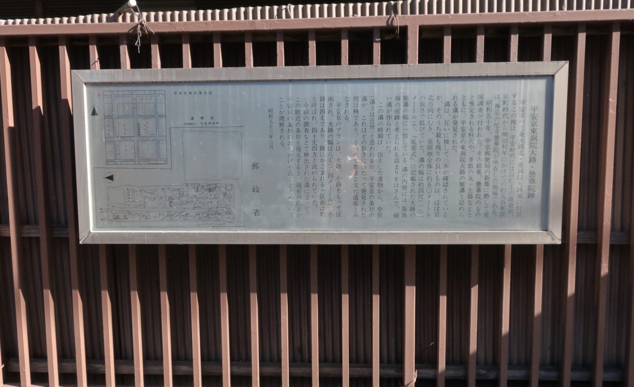 東洞院通は南北に長い通りだが、この項目で言われているのは三条通東洞院東入ルの中京郵便局にある遺構「平安京東洞院大路跡・曇華院跡」のことを指す。中京郵便局を新築した際に発掘された遺跡だ。洞院とは「上皇の御所」という意味でこの通りには実際、上皇の御所が多くあったという。そしてこの地は平安末期に平家追討の令旨で知られる以仁王の屋敷があったほか、室町から明治にかけては禅宗の尼寺・曇華院が所在したという。現在は同郵便局の外壁に説明版があるのみで、観光的には少し寂しい。