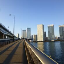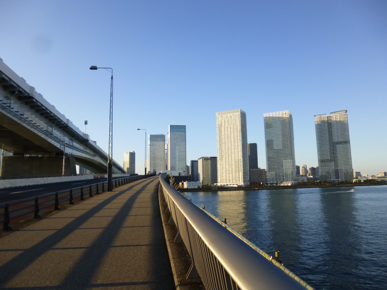 晴海大橋は、晴海と豊洲を結ぶ全長580メートルの橋で、上り線と下り線の間には首都高速10号線が通っています。橋の下には晴海運河が流れており、対岸には高層ビル群の姿が見えます。とてもダイナミックな光景で、日中と同様かそれ以上に夜景も素晴らしかったです。