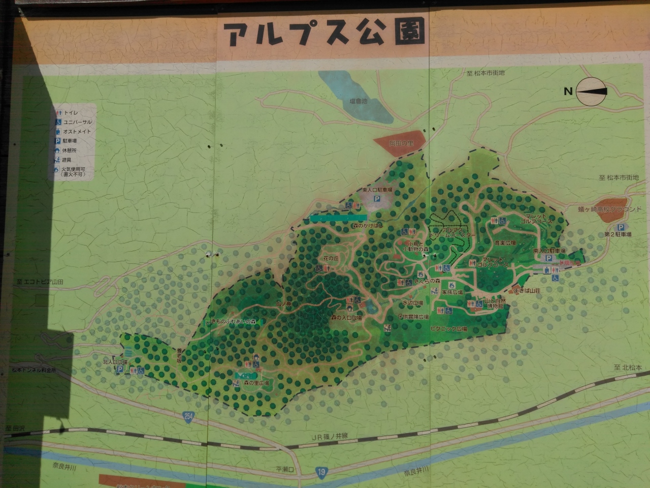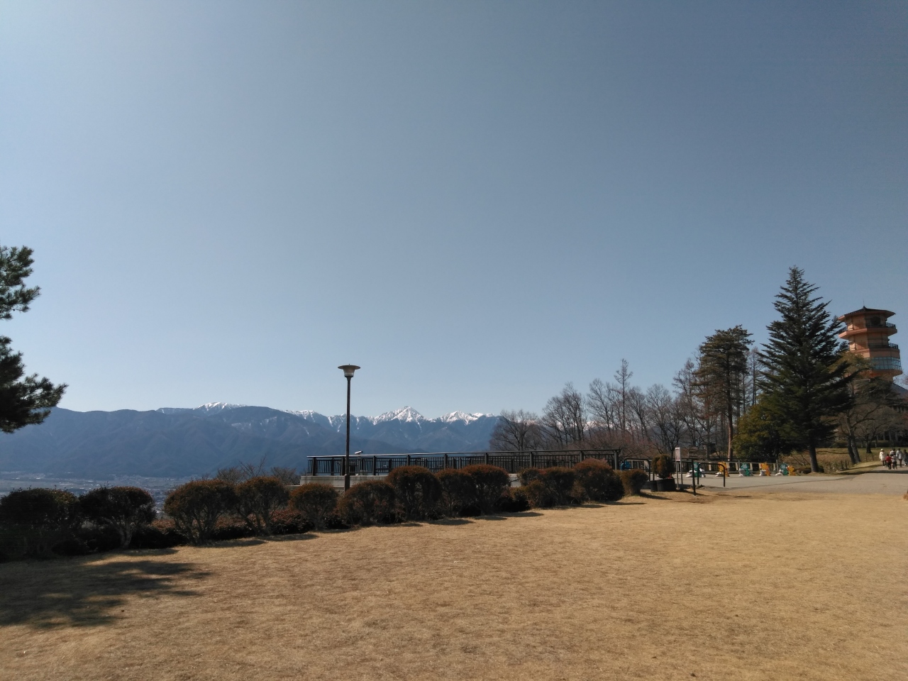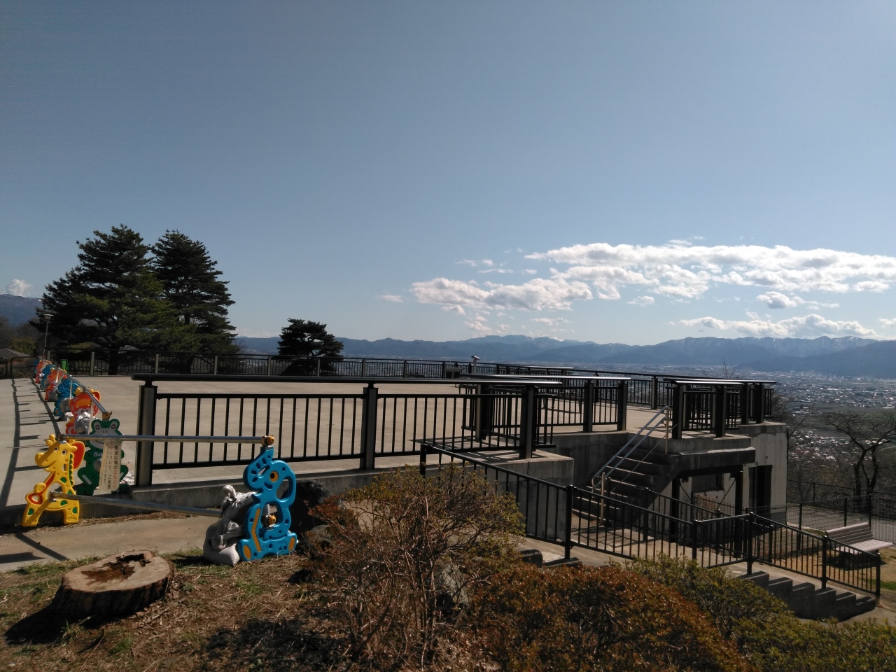何ヶ所かに広い無料の駐車場があります。南入口駐車場に車を停めて、山と自然博物館の展望室へ行きました。途中に、北アルプスや市街地を一望出来る展望広場がありますが、「郷土不足」とかで立ち入り禁止になっていました。広い公園で、広場やローラー滑り台などもあって、平日でしたが春休みのせいか、子供連れの人で混んでいました。