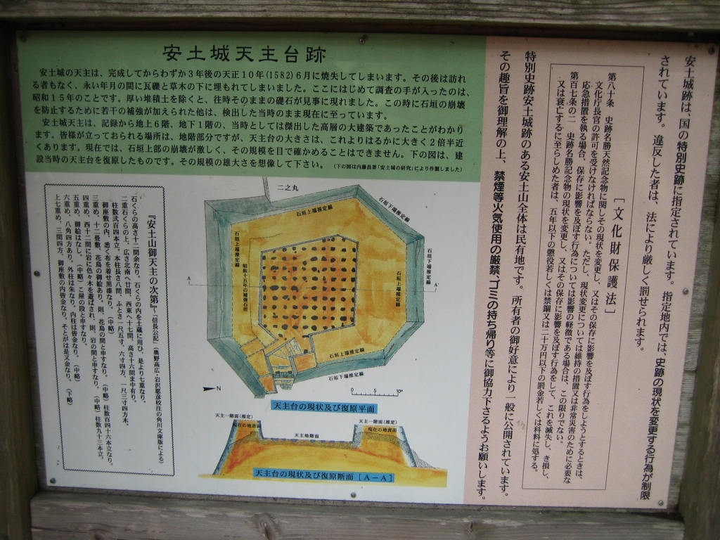 安土城は織田信長によって琵琶湖東岸の安土山に建造され、大型の天守を持つなど威容を誇った城。地下1階地上6階建てで、天主の高さが約32メートル。それまでの城にはない独創的な意匠で絢爛豪華な城であったと推測されている。
