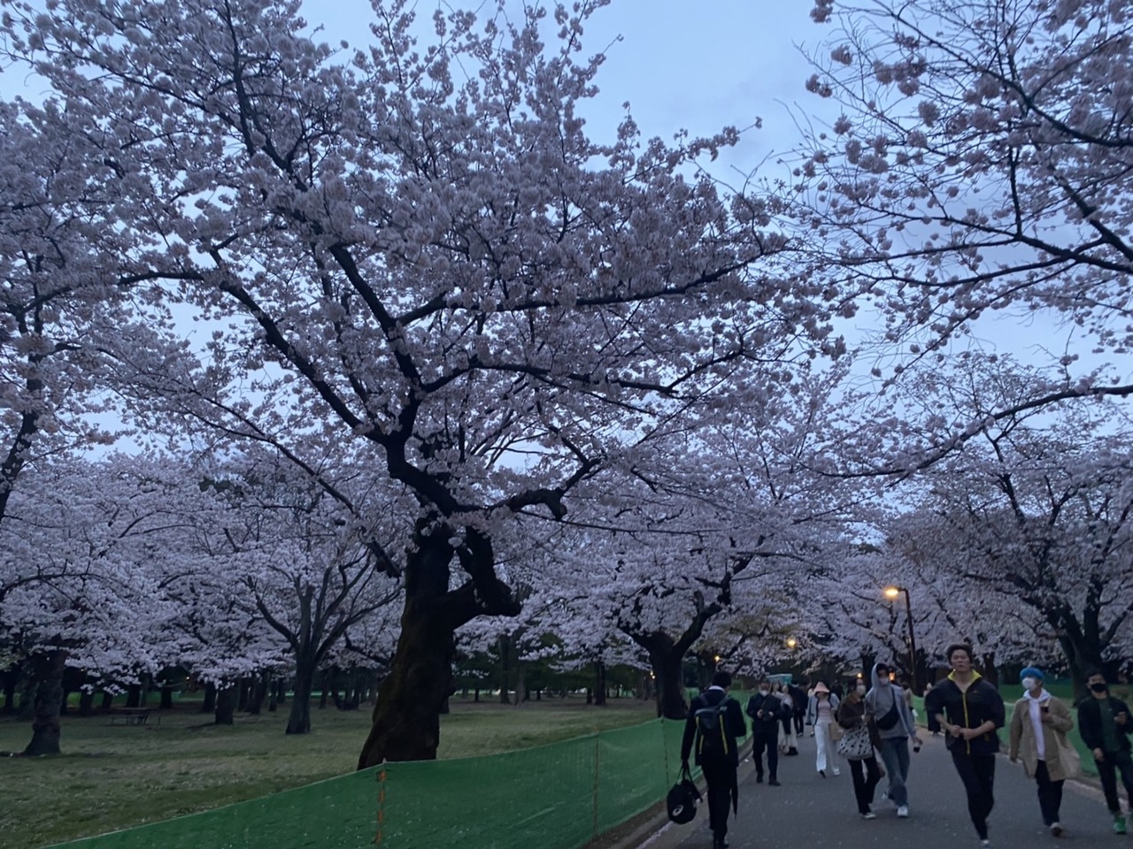 代々木公園は、JR原宿駅から徒歩3分のところにある54haの広い公園です。都会のオアシス的な存在です。4月に花見に行きました。この公園には、ソメヨシノをはじめ約600本の桜が植えられています。夕方でしたが花見客でいっぱいでした。