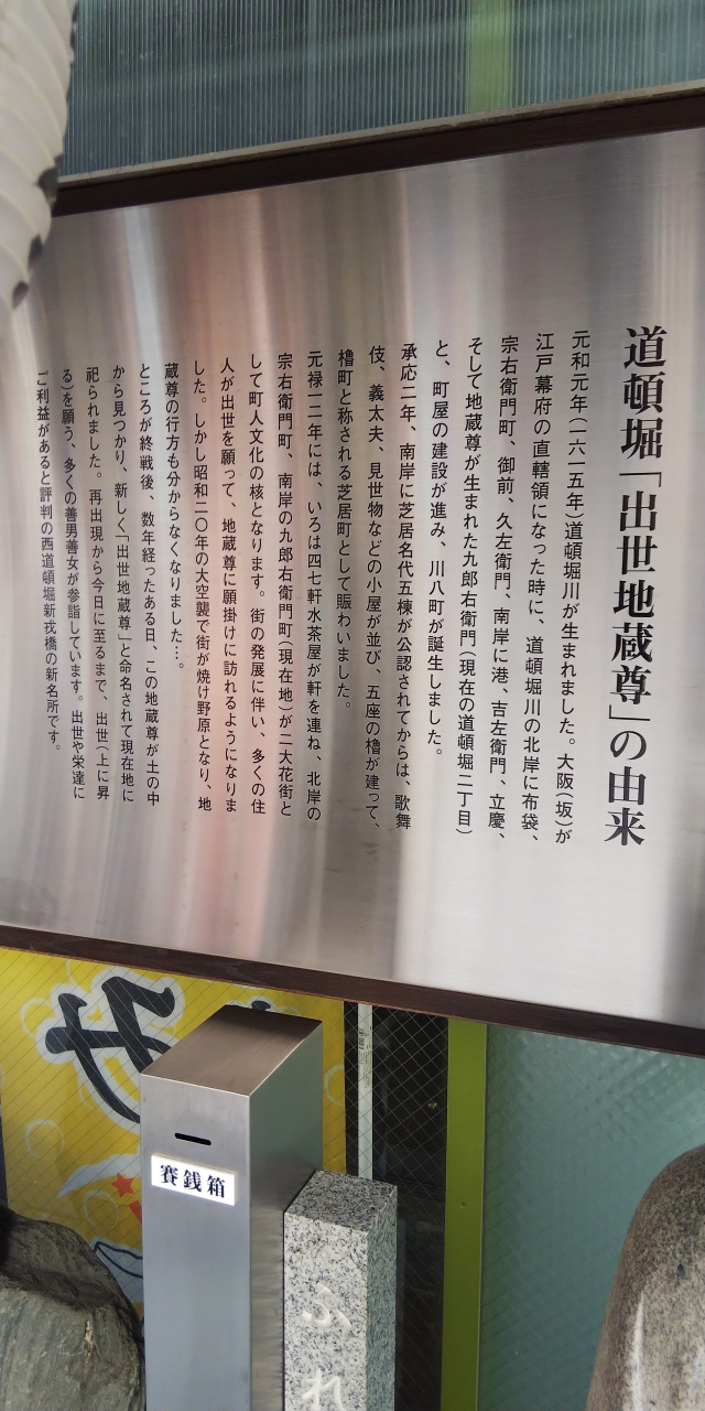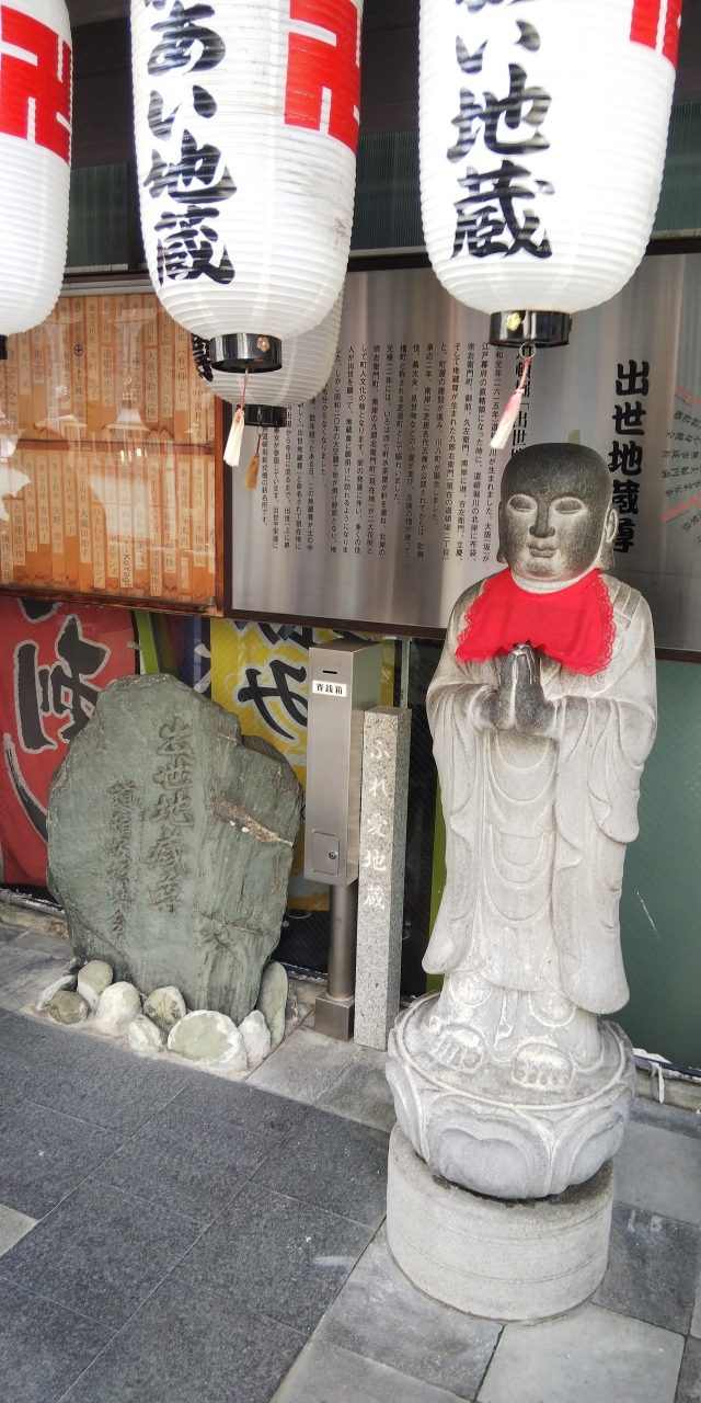 出世地蔵尊は大阪・ミナミを流れる有名な川の道頓堀川の新戎橋のたもとにあります。新戎橋自体があまり大きな橋ではないので、すぐに見つけることができると思います。向かって左側には水子地蔵尊さん、右手側に出世地蔵尊さんが並んでいます。