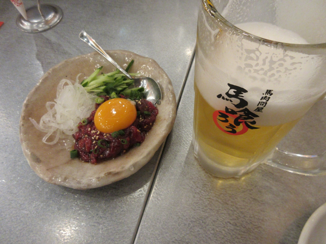 期間限定のハッピーアワー的メニューがあり、500円でビール1杯と馬肉のユッケか馬肉の唐揚げがセットになっていました。お通しがありませんので、最初の1杯と1品に最適でした。