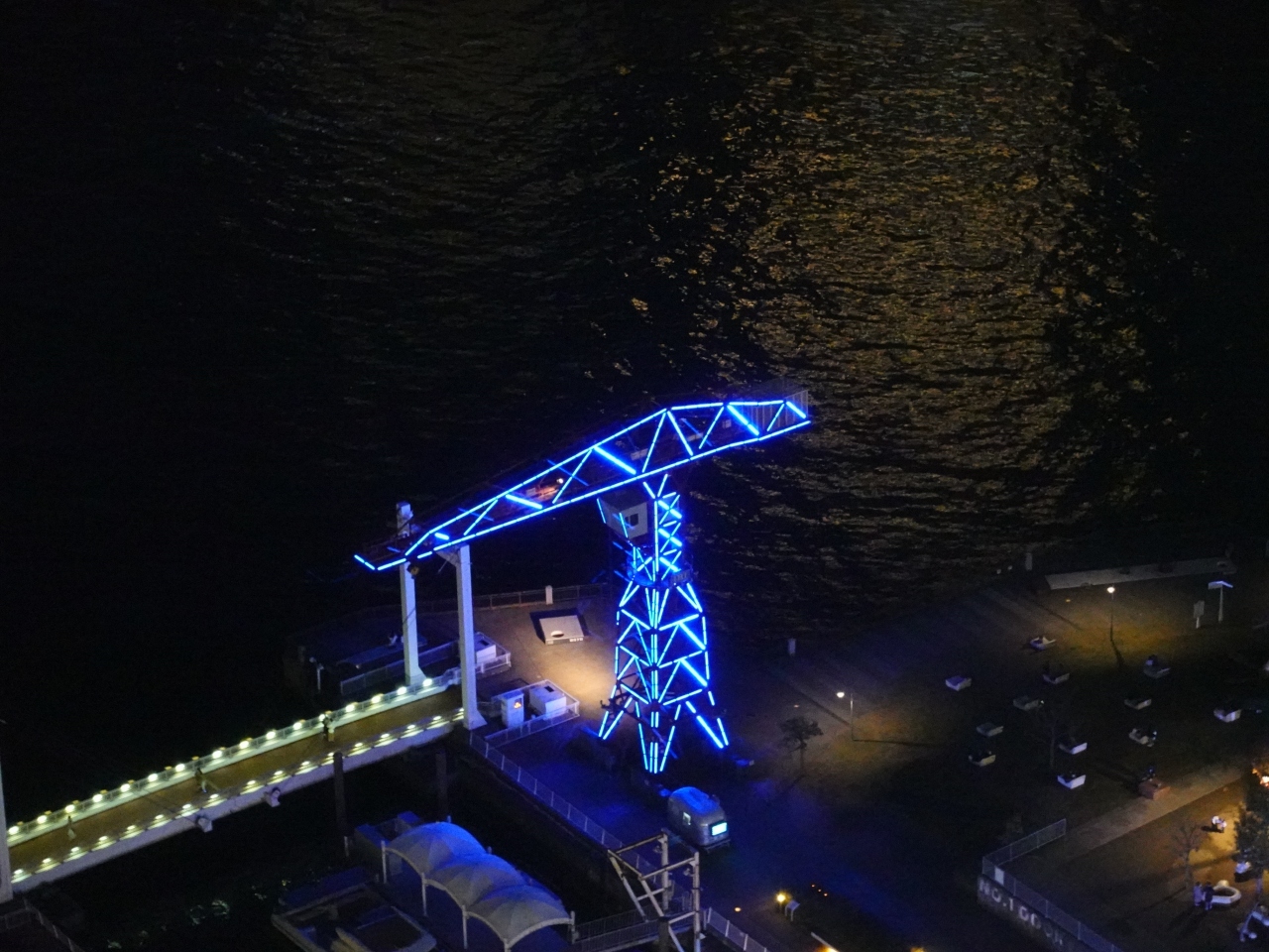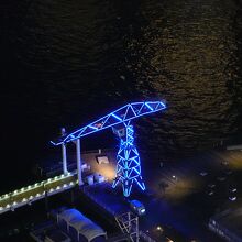 「ららぽーと豊洲」のシーサイドデッキに、高さ25メートルの大きなクレーンがあります。これは、かつてこの場所に石川島播磨重工業の造船所があった時代のクレーンをモニュメントとして残しているものです。この日は夜空に青く輝いており、美しい姿は遠くからも目立っていました。