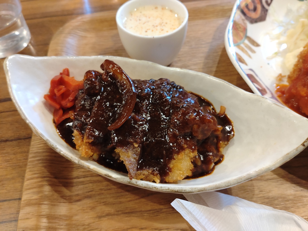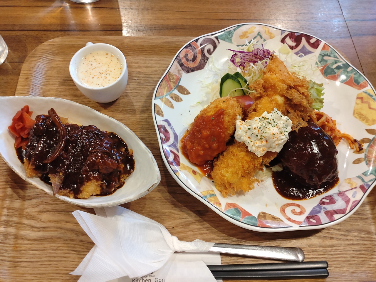 ランチだったので、ハンバーグとフライが選べるゴンランチを選択。ピネライスはカレーソースかデミグラソースから選べますが今回はデミグラソース。トンカツは、「ピネ」の通り5mm程度とかなり薄めですが、この薄さがソース、炒飯とを一体化させる鍵のような気がする。サクッと軽い食感で、柔らかくて美味。ハンバーグもエビフライ、カニクリームコロッケも美味で満足感の高いランチです。しかし、やっぱりここに来たら思いっきりピネライスを食べたほうがいいかな。とはいえ、ジャンクだけど好きなものが入っているご馳走です。また、平日のランチは小さなコーンポタージュスープがサービスでつき、これも濃厚な味で美味。