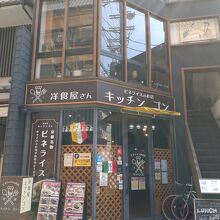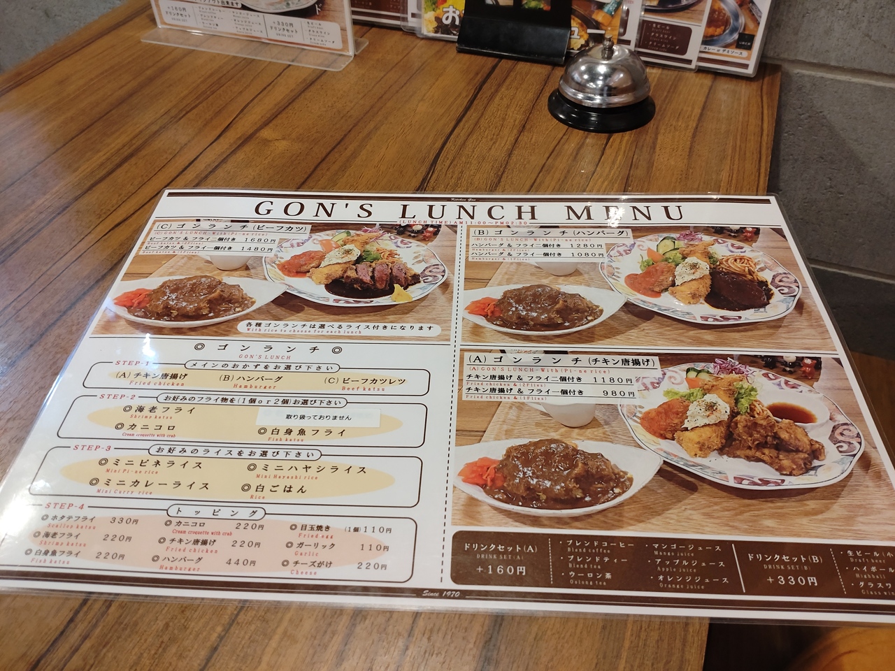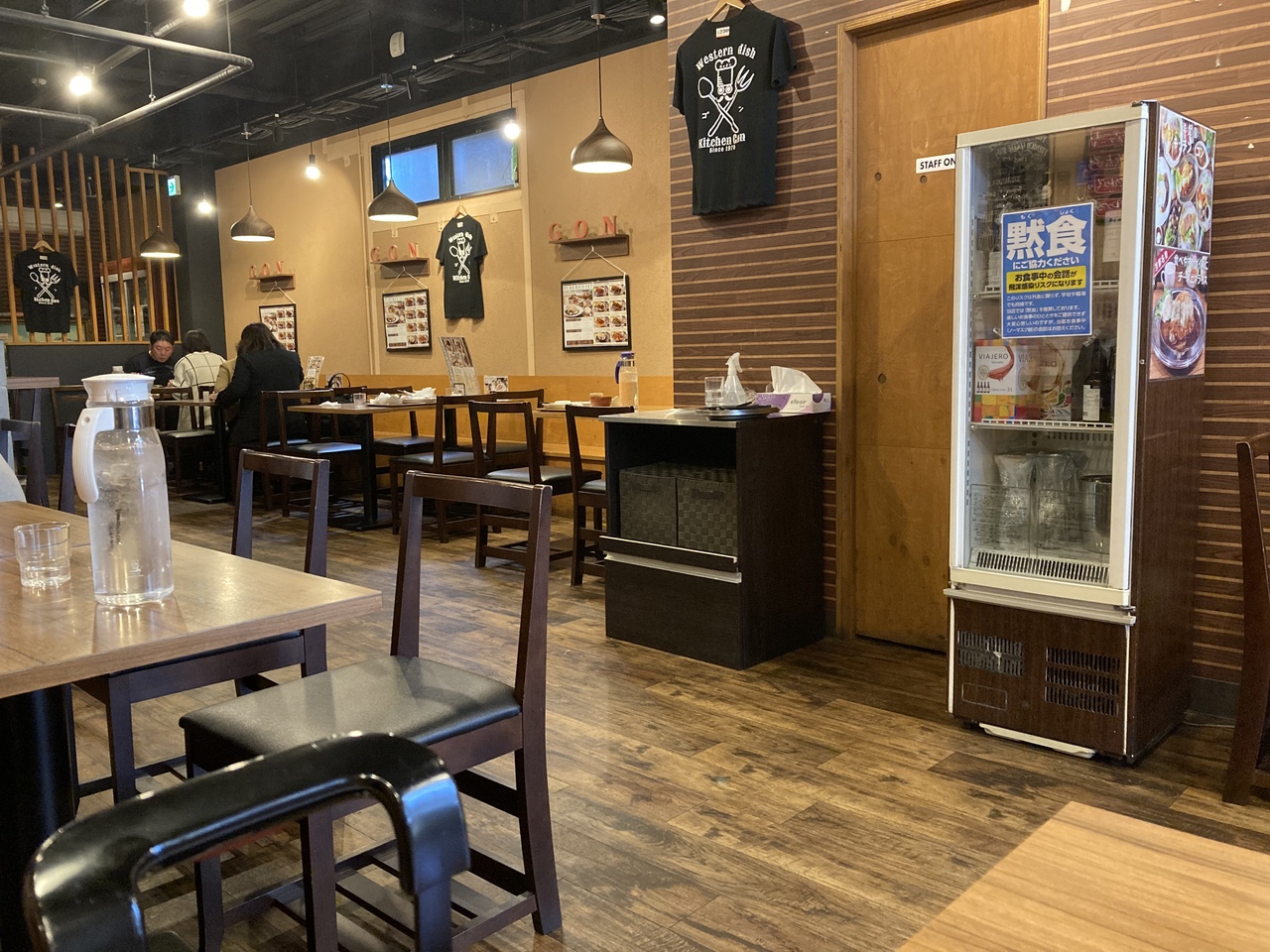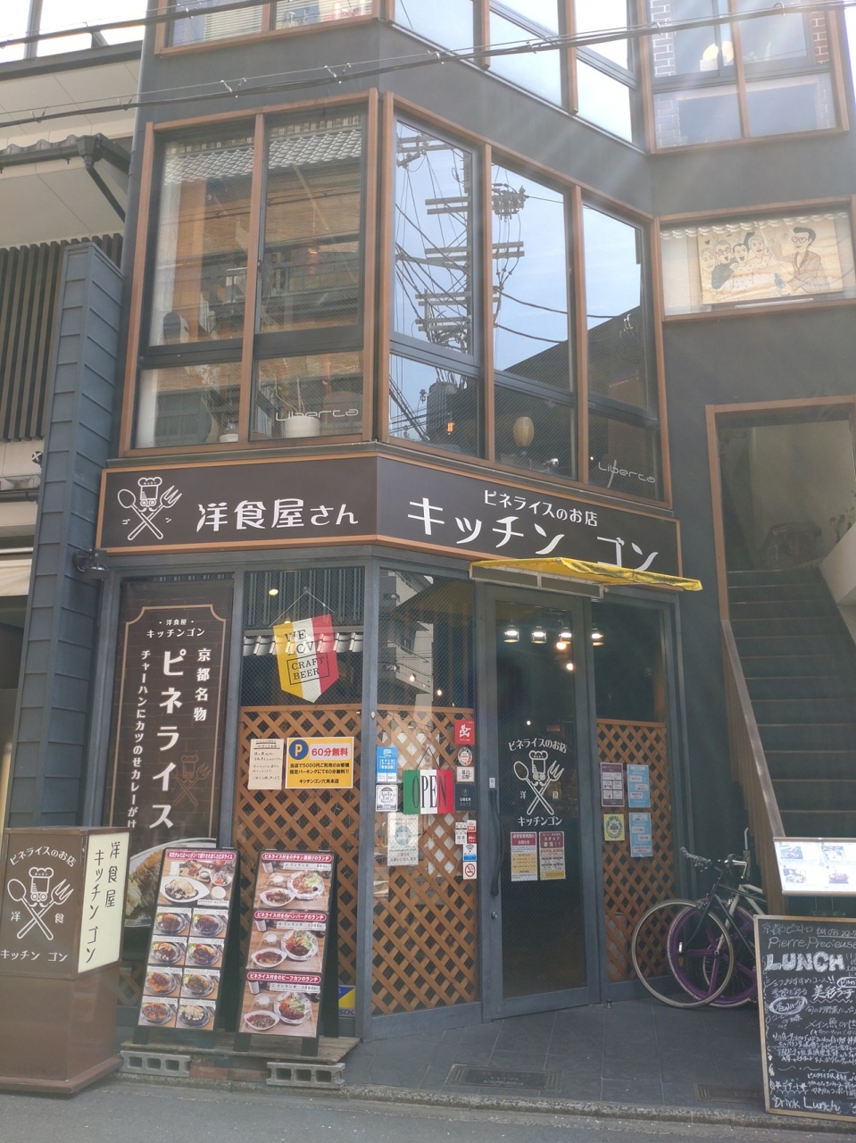 地下鉄烏丸線・東西線烏丸御池駅、阪急烏丸駅から徒歩5分くらい。六角通り沿い、高倉通りとの交差点の先のビルの1階にある洋食店。「キッチンゴン」といえば、1970年に丸太町通の一筋先の椹木町通に創業した洋食店で、看板メニュー「ピネライス」が有名。ピネライスとは、玉ねぎとハム、玉子が具材のシンプルな炒飯の上にトンカツがのり、さらにカレーソースかデミグラソースをかけたもの。京都生まれの洋食で、一つで炒飯もトンカツもカレーかハヤシが楽しめるワンプーレートメニュー。アメリカでの修行経験のある創業者が、ボリュームのある美味しい洋食を気軽に食べてほしい、という想いから考案されたもの。ビネライスの「ピネ」とはフランス語の「薄い」という意味のフイネから来ているとのこと。今はこちらが本店ですが、少しややこしくて、2017年、丸太町通の御所のお店が六角に移転。さらに西陣の本店をFC展にして、ここ六角店が本店になりました。従ってコチラが本家本元のピネライスを食べられるお店かと。