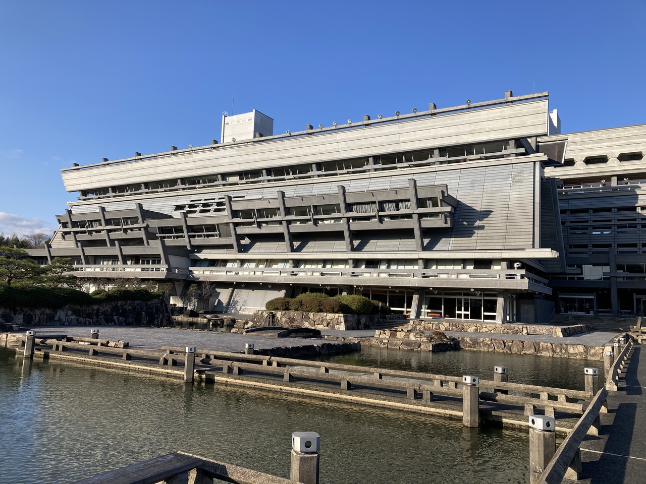 会議場、展示施設、宴会場、多目的施設からなる施設の設計は、日本で初めてコンペによるもので、東大名誉教授であった建築家の大谷幸夫氏によるものを採用。日本古来の合掌造りと現代建築様式が融合したデザインは、コンクリートながらも和を感じさせます。また、付帯施設として池と木々からなる広大な日本庭園は、隣接する宝ヶ池と一体化しており。さらに春には桜を楽しむこともでき、開花時期には一般にも公開されています。