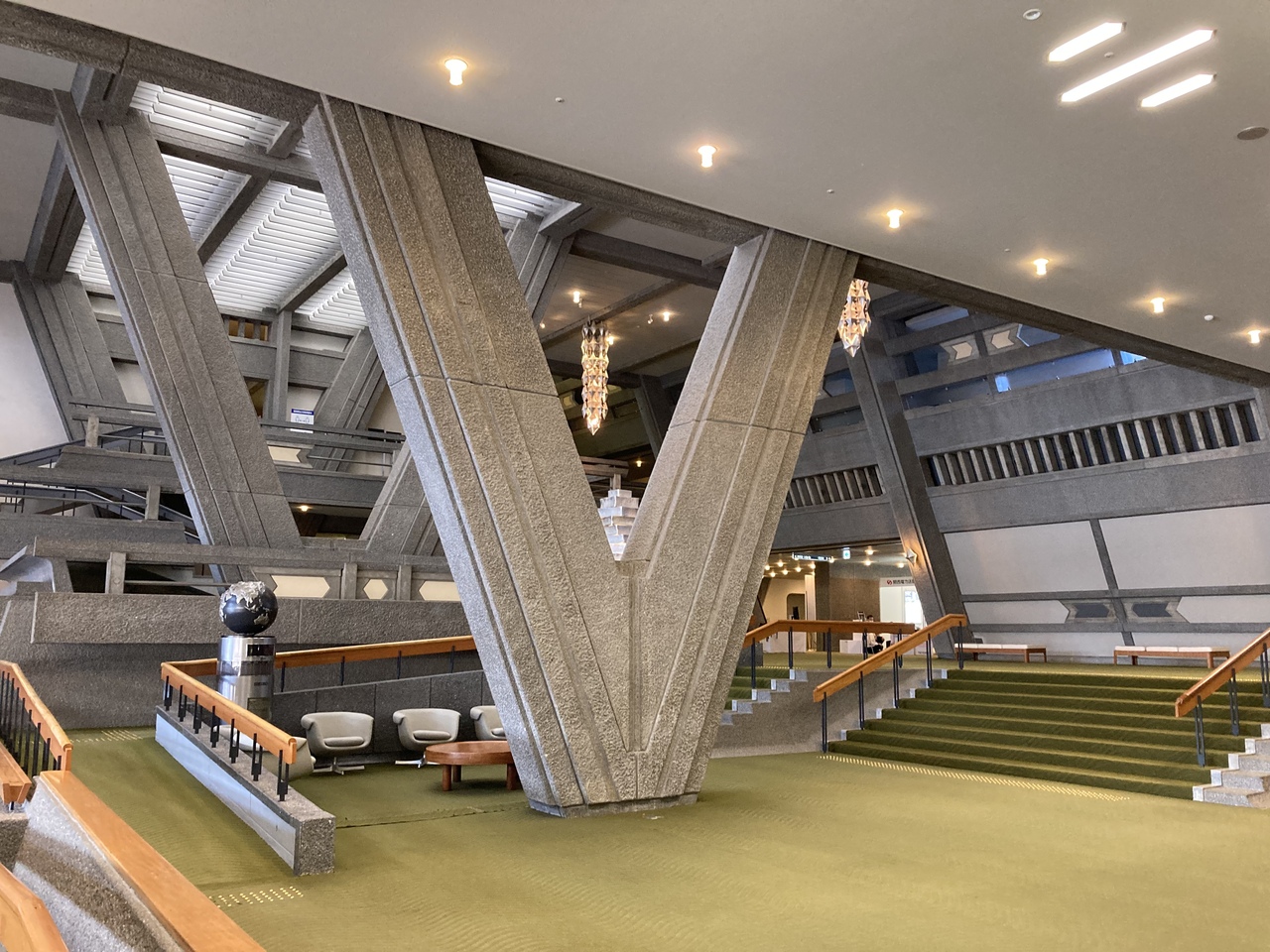 1972年に増築工事、1985年にイベントホールが完成しできますが、同じ大谷氏の設計によるものです違和感はありません。2003年には日本建築学会から「日本モダン・ムーブメント100選」に選定されるなど、数々の賞も受賞しています。また、インテリアはジャパン・モダンと呼ばれる礎を創ったと言われ、ヤクルトの容器デザインで有名な世界的デザイナーの剣持勇氏が担当。日本的な感性と素材の特性や加工技術を多様した機能的なもので、今でも古さを感じさせません。