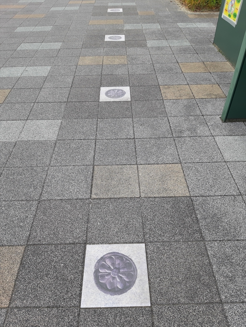 その道筋の歩道には、発掘された陸奥国分寺創建時の瓦の模様をモチーフにしたタイルが点々と続いているので、それを追って行きましょう。
