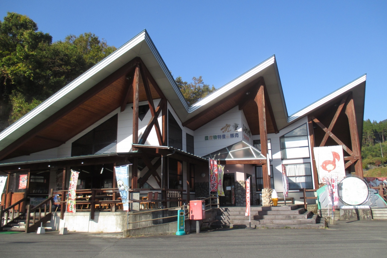 九重ふるさと館は国道210号線と県道681号線の交差点にありました。特徴的な形の屋根を持っていますから目立ちました。交通の便は良いと思いますが、駐車場は広くないので10数台で満車です。ちょっと利用しづらい感じがしました。一度に多くのお客さんがやってくることは想定されていないのでしょう。中は手作り品を含めて産直品売場と食事処がありました。