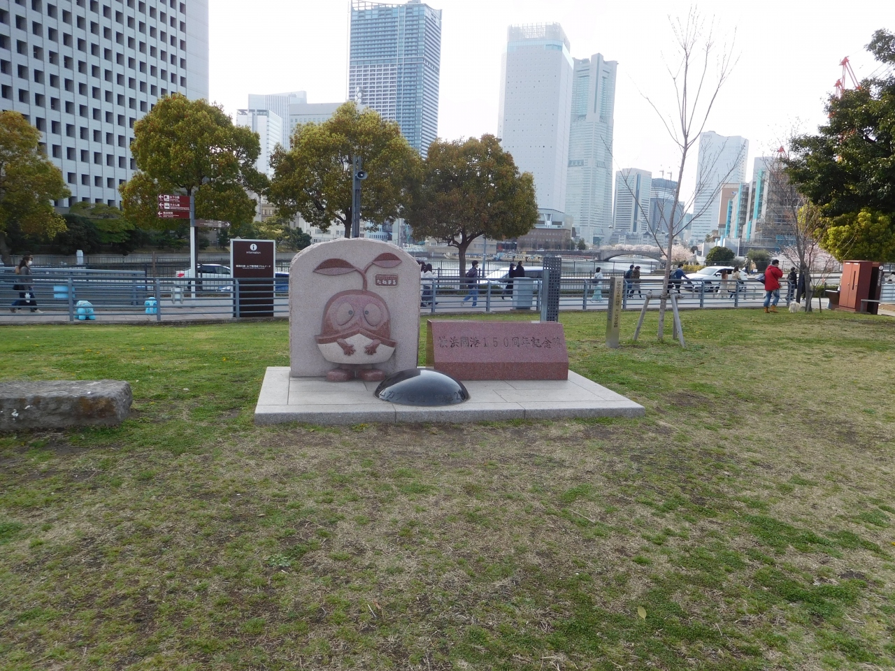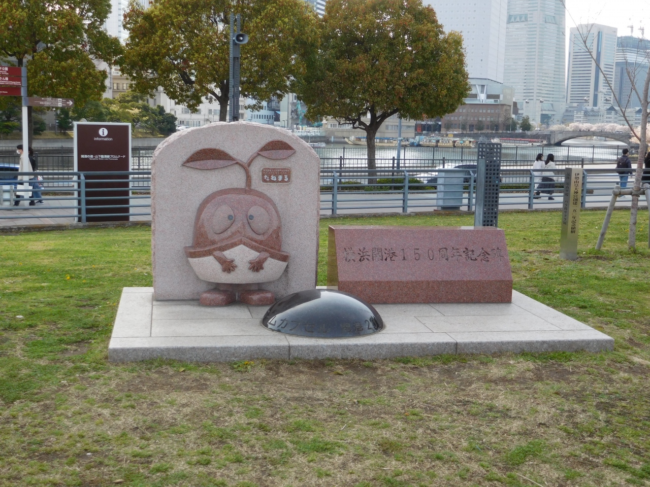横浜開港150周年(2009年)に開催された「開国博Y150」のマスコットキャラクター「たねまる」の記念碑です。「象の鼻パーク」の赤レンガ倉庫側の芝生広場にひっそりとあります。歩道沿いに歩いていると全く気付かない場所で、海側から芝生広場の坂を上って行くと発見出来るような、穴場的スポットだと思いました。