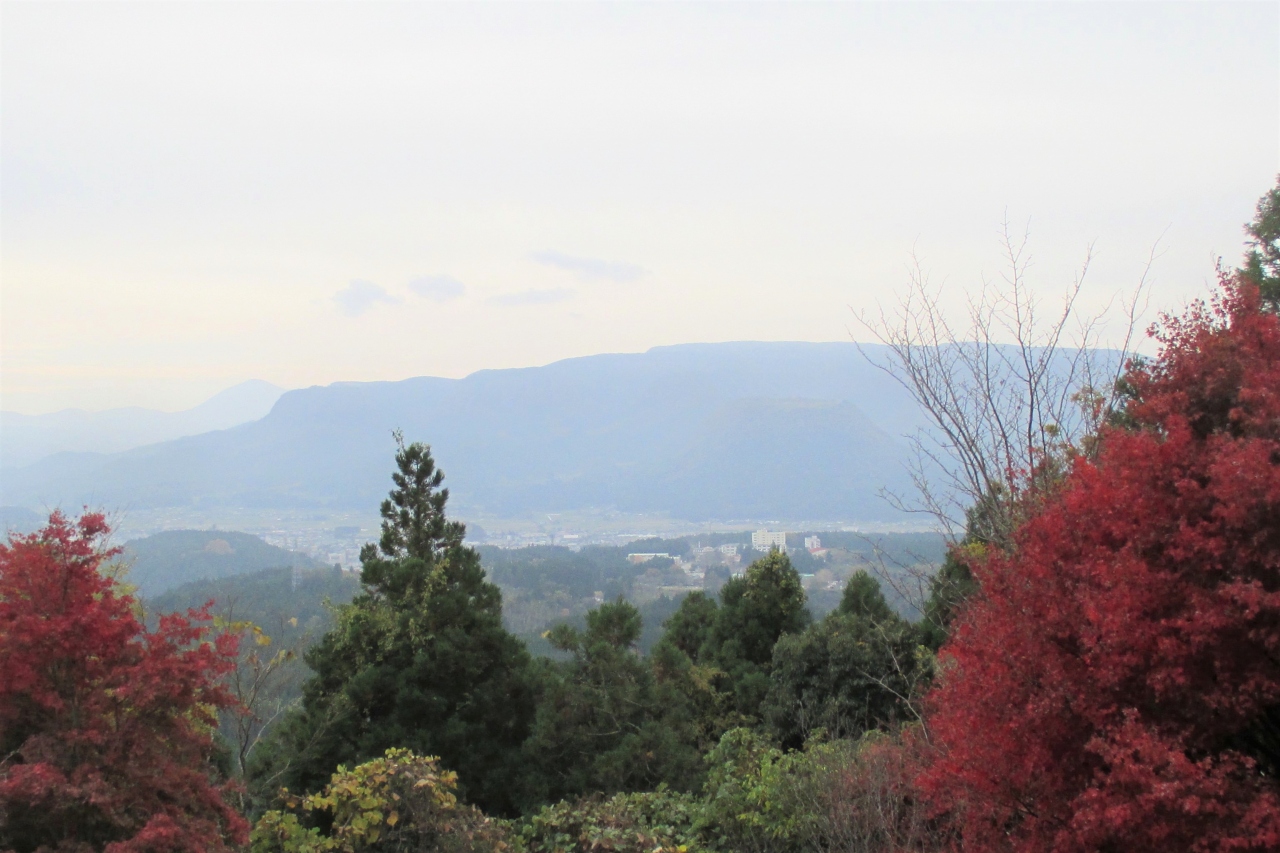 角牟礼城跡のある角埋山は、玖珠盆地の北の外れにあります。ここから玖珠盆地を眺めると、特徴的な形の伐株山が見え、その奥に平らな山頂を持った万年山がドーンと横たわっていました。万年と書いて「はね」と読むのですね。それにしても玖珠盆地周辺にはメサの万年山や大岩扇山が、そして、浸食が進んだビュートの伐株山や角埋山などがたくさんある特別な地域なのを改めて思いました。余談ですが、万年山の左に、玖珠富士と呼ばれる涌蓋山が見えました。その山容の極端な対比もまた一景でした。