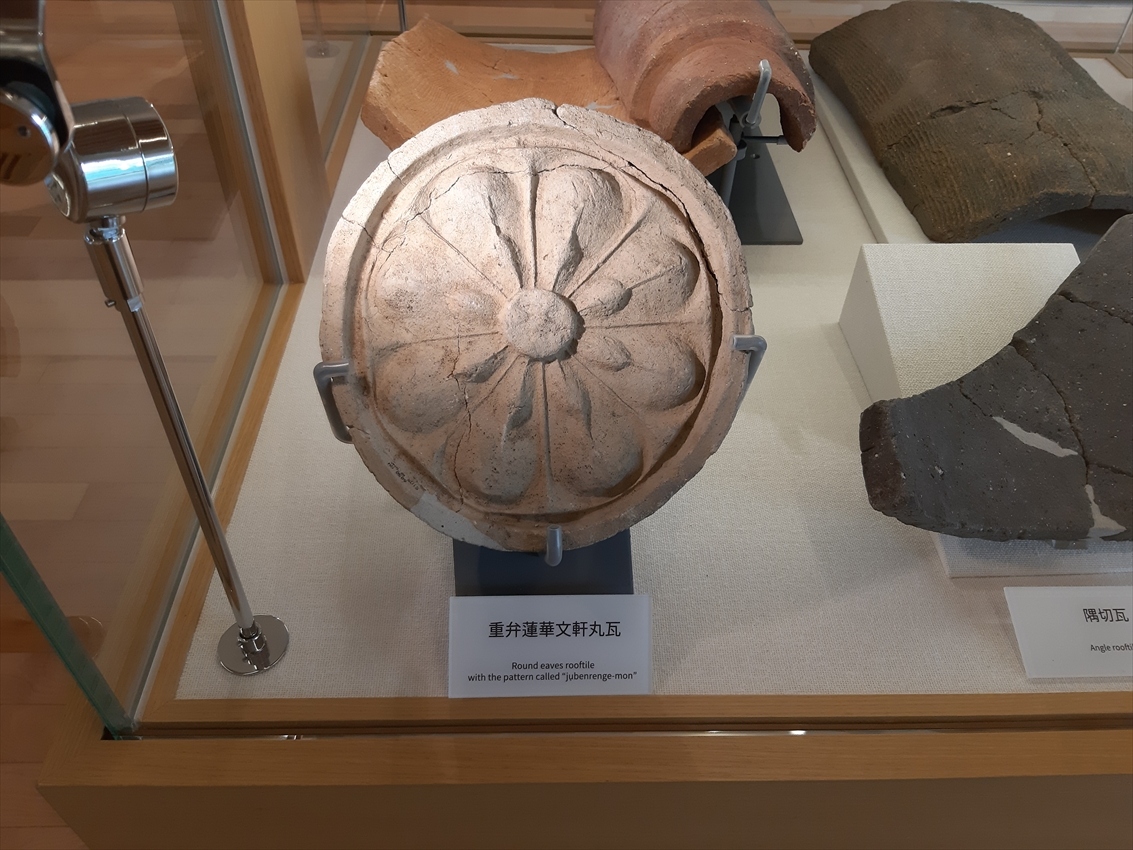 その道筋には花の模様をモチーフにしたタイルが続いていますが、出土品を見ている内に、それは出土した瓦の一つにある模様だと気付いたのが楽しい発見でした。