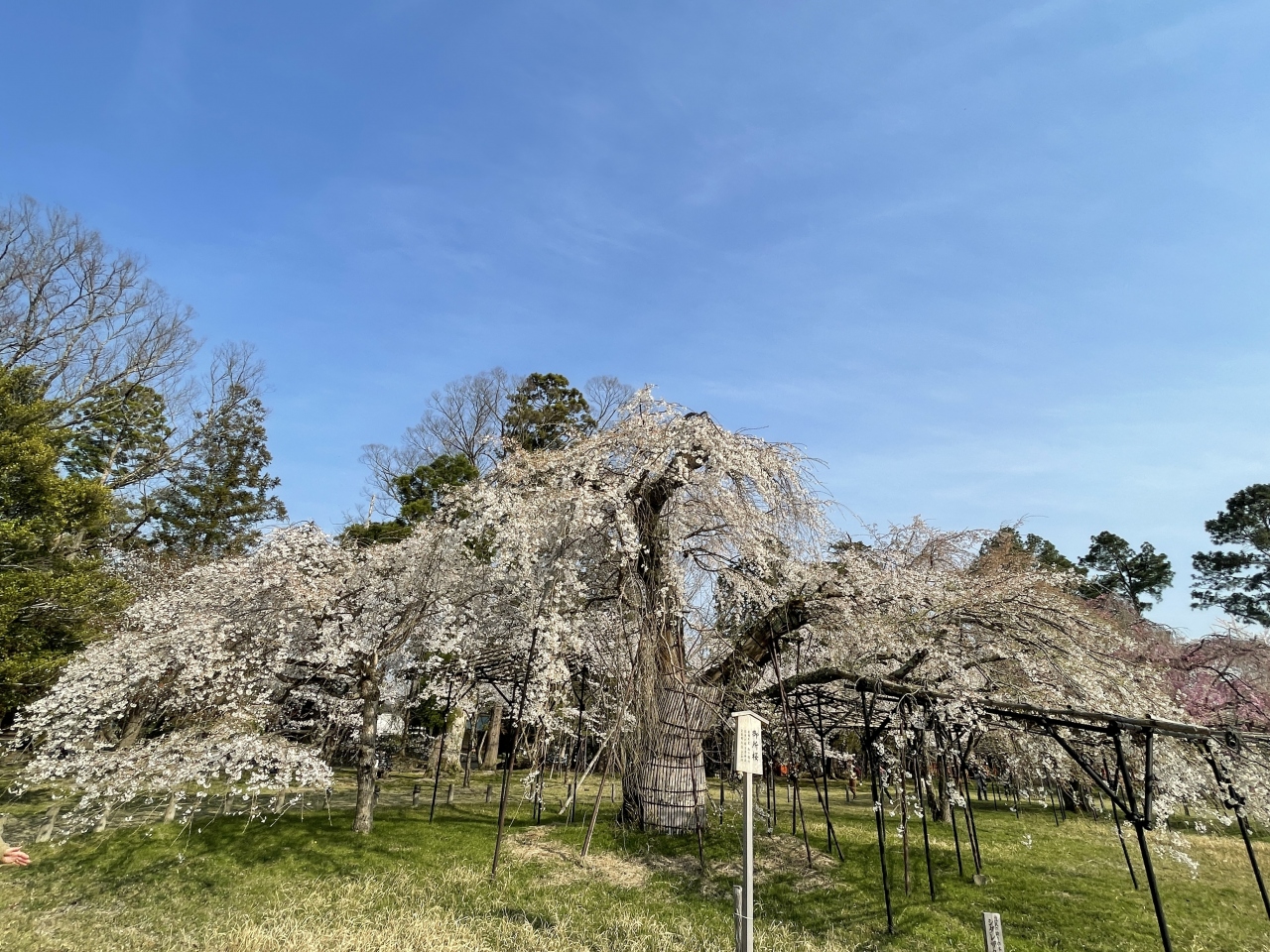 桜の時期に訪問しました。鮮やかな朱色が青空に映えてとても華やかな神社です。参拝した後、有名な御所桜と斎王桜を見に行きました。一の鳥居と二の鳥居の間にあり、御所桜は満開を過ぎようかという頃合いで、斎王桜は2分咲き程度でした。2本が並んでいるので、御所桜の清楚さと斎王桜の紅のあでやかさがお互いを引き立てていました。