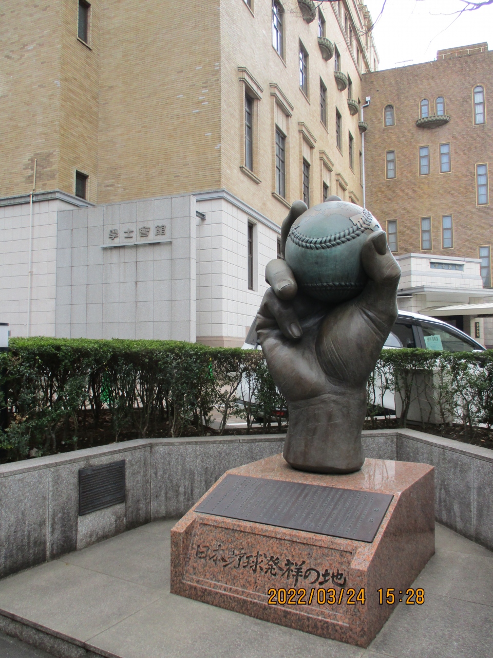 地下鉄の神保町駅A9出口を出たところに、野球のボールを握った手の記念碑がありました。この場所は日本の野球発祥の地を記念して建てられたそうです。とても大きな記念碑で、よく見ているとボールの縫い目に日本とアメリカが描かれているようです。野球を通して日本とアメリカの友好が表された象徴だと感心して眺めました。
