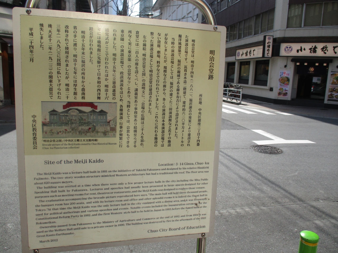 銀座3丁目を中心に散策していた時に、祝橋近くに案内板が立てられていたので立ち寄ってみました。明治のころこの場所に演説会場として建てられた明治講堂跡だそうです。案内板には当時の建物の様子が描かれていました。とても立派な施設だったことがわかりました。関東大震災で焼失してしまったのが残念に思いました。