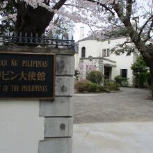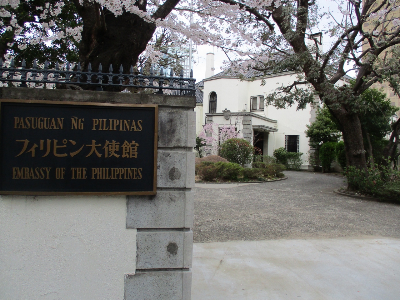 九段下から中坂を上り切った近くに、フィリピン大使館がありました。建物はレトロな白い洋館で、どこか教会風な素敵な建物でした。大使館なので警備が厳重かと思いましたが、門から庭の中をのぞくこともできました。ちょうど桜が咲いていて、異国情緒も感じられる、とても雰囲気の良い大使館だと思いました。