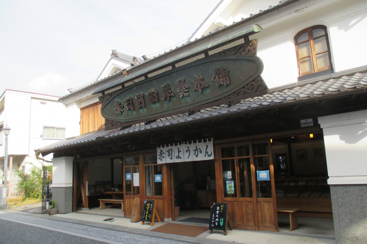 田舎庵と駐車場を挟んだところに、白壁の赤司日田羊羹本舗がありました。建物は創業した1891年(明治24年)ころのものだそうです。日田羊羹と名乗っていますが、まったく浮気?をせずに、創業以来羊羹一筋なのだそうです。(羊羹の種類は増えていますが)もっとも伝統なのは「赤司の日田羊羹一枚物(又は、流し)」と呼ばれる「小豆こし」とのことでした。パック入りのものを求めていきましょう。