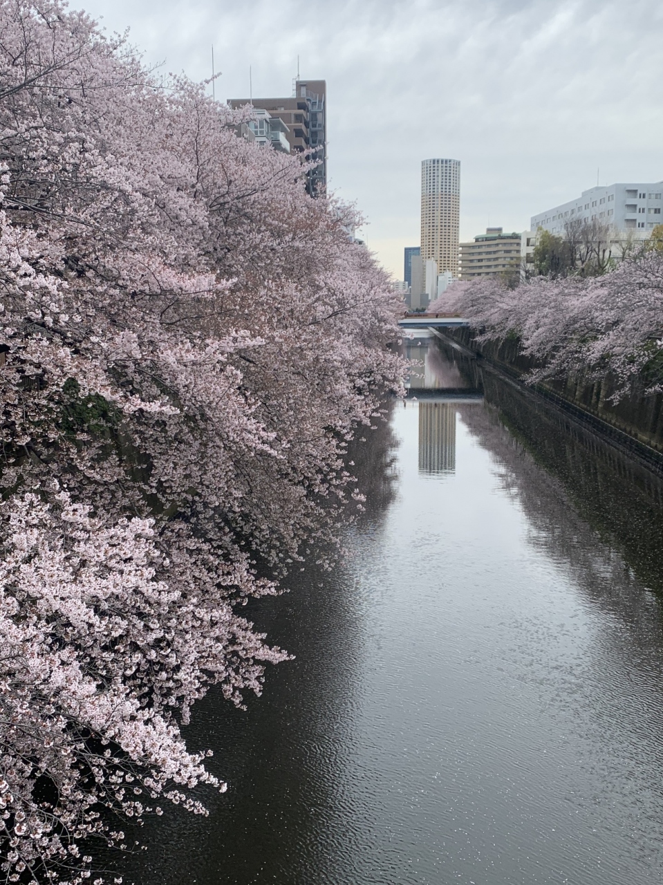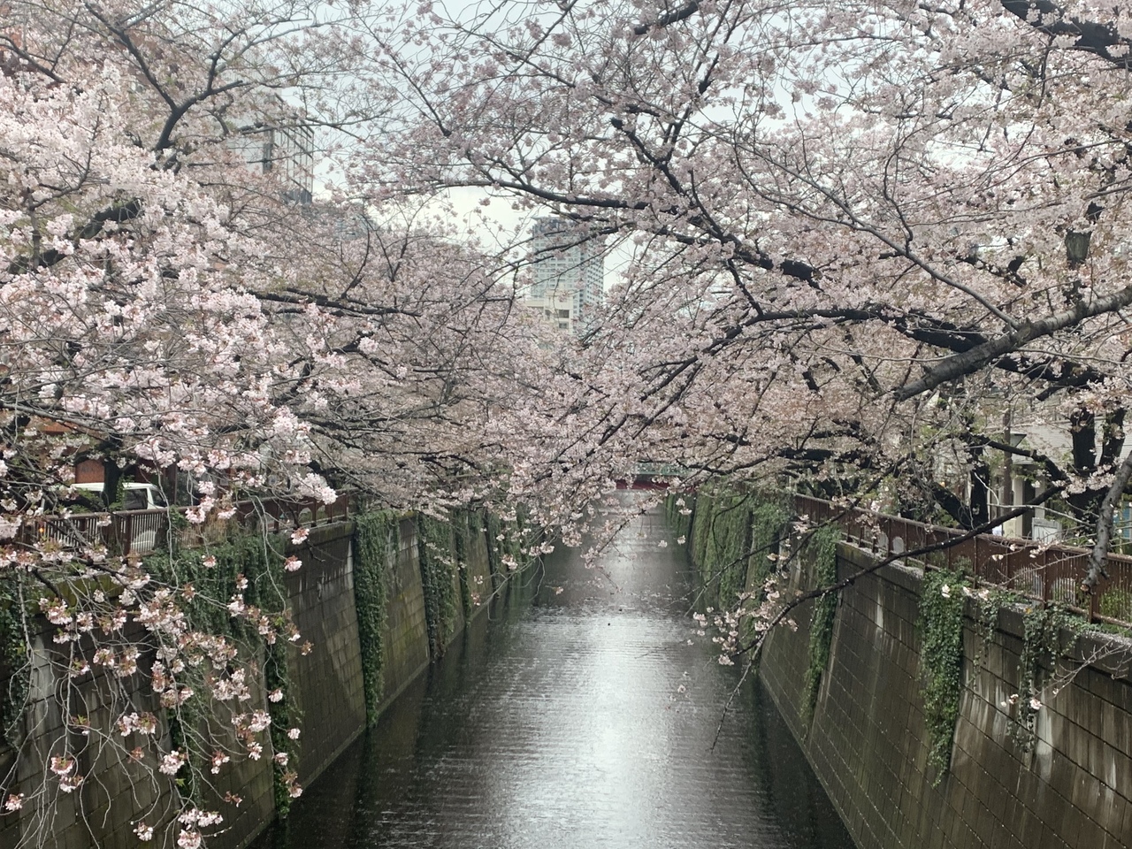 目黒川に両側からせり出した満開の桜は圧巻です。