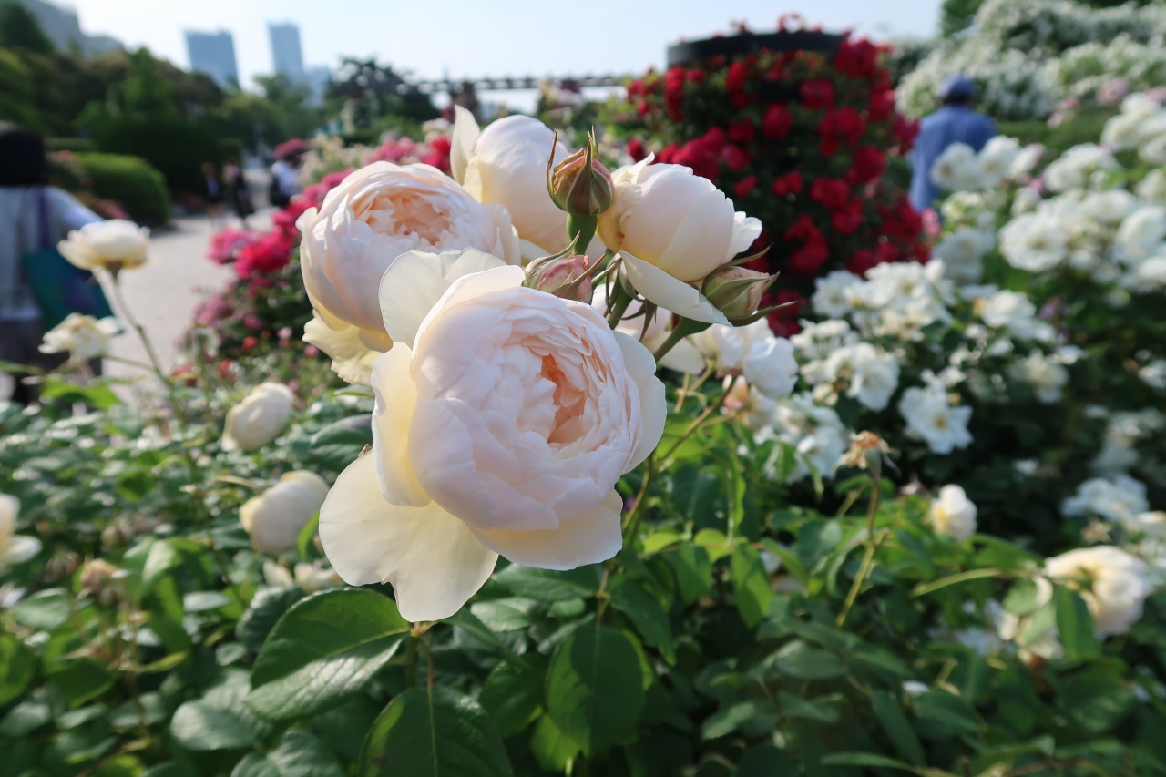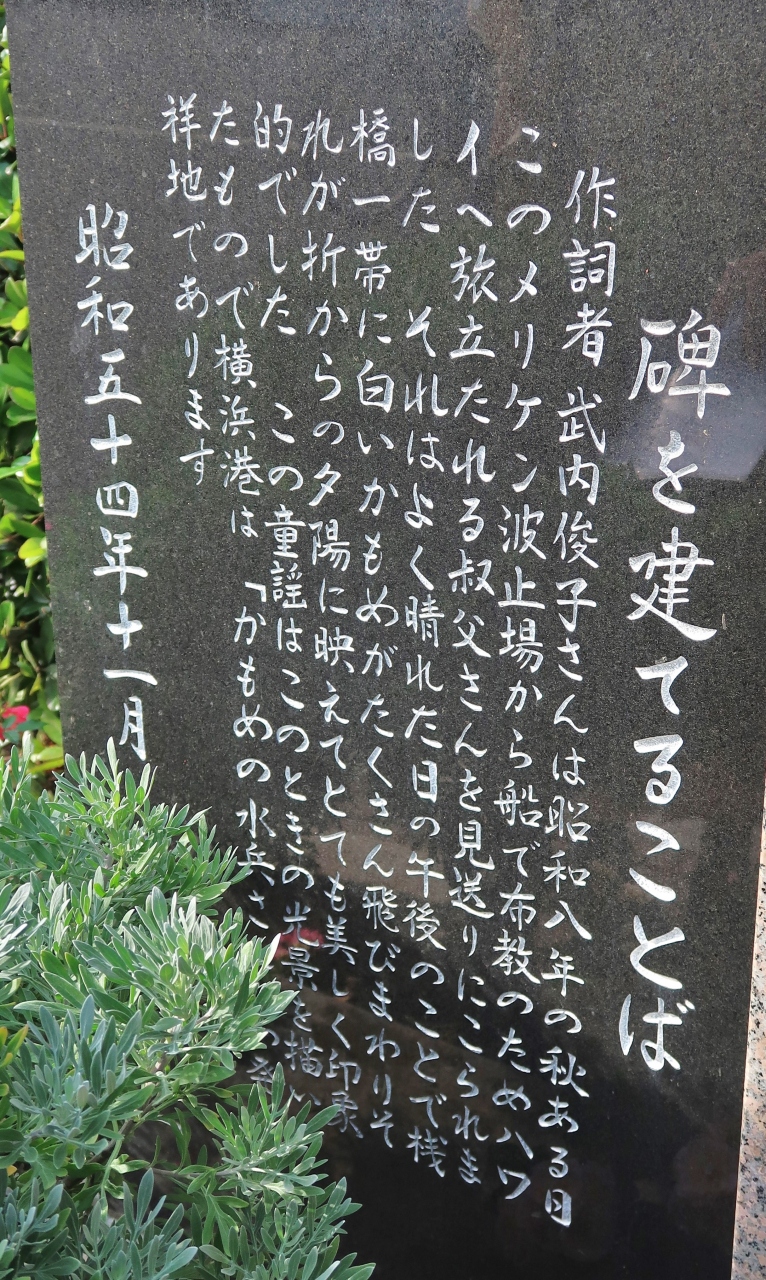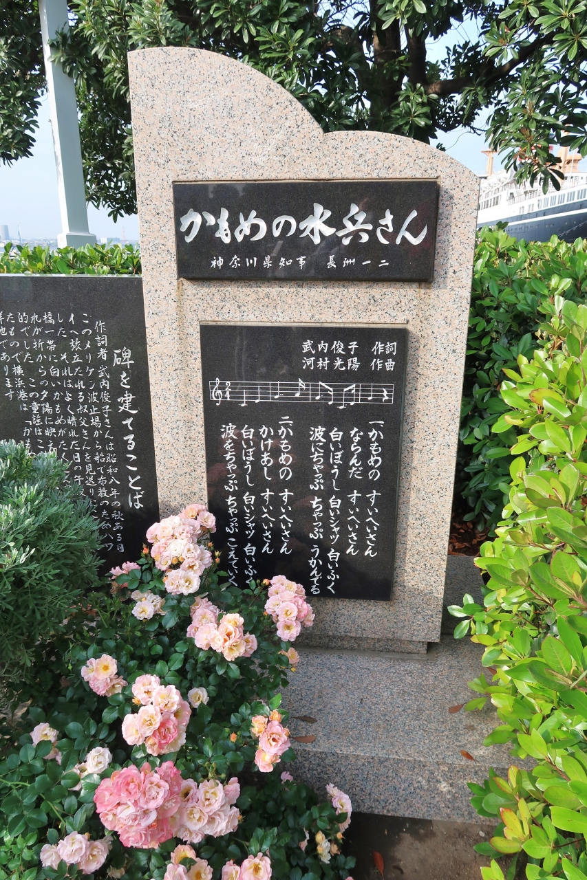 山下公園中央の噴水、水の守護神を見て、バラ園に向かう途中に歌碑があります。残念ながらかもめはいませんでしたが、シーズンに行くと氷川丸の鎖に止まるかもめが見られるようです。今回はバラ園でバラを鑑賞して、かもめは次回に。