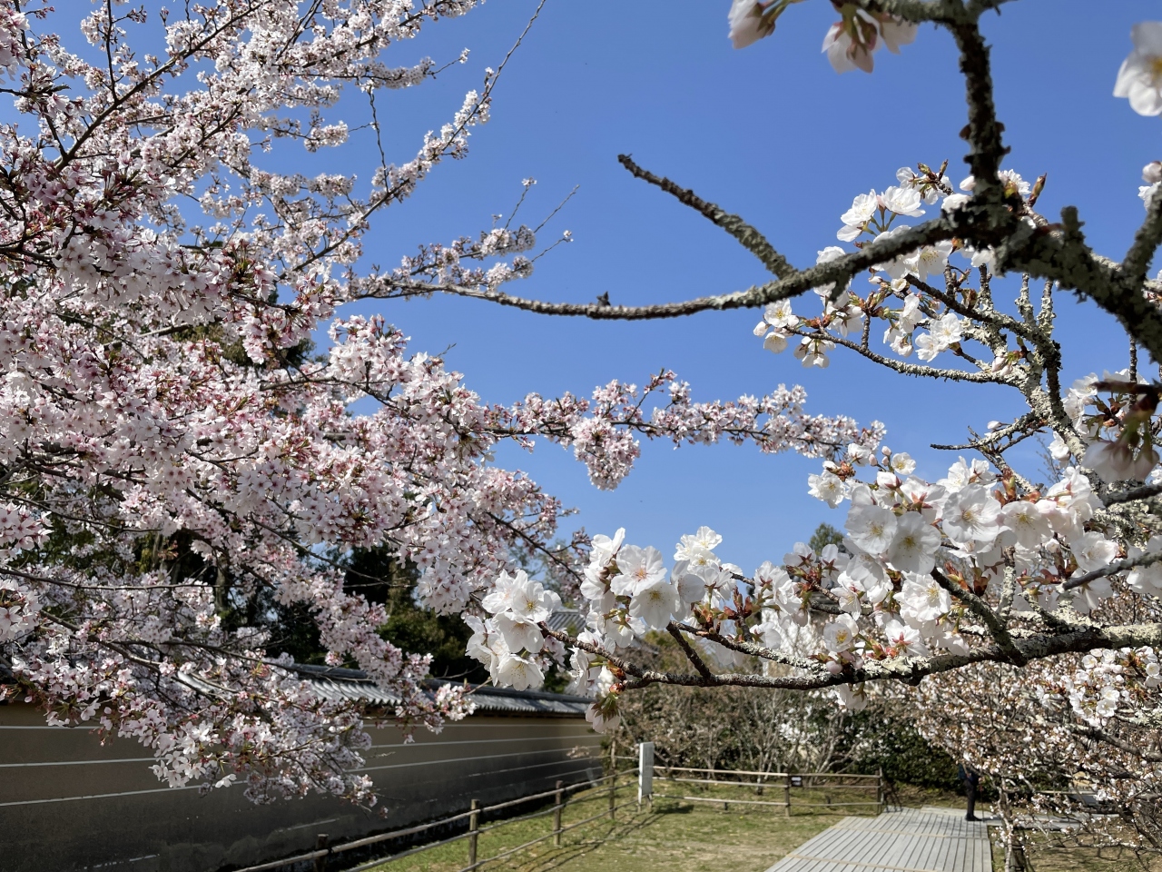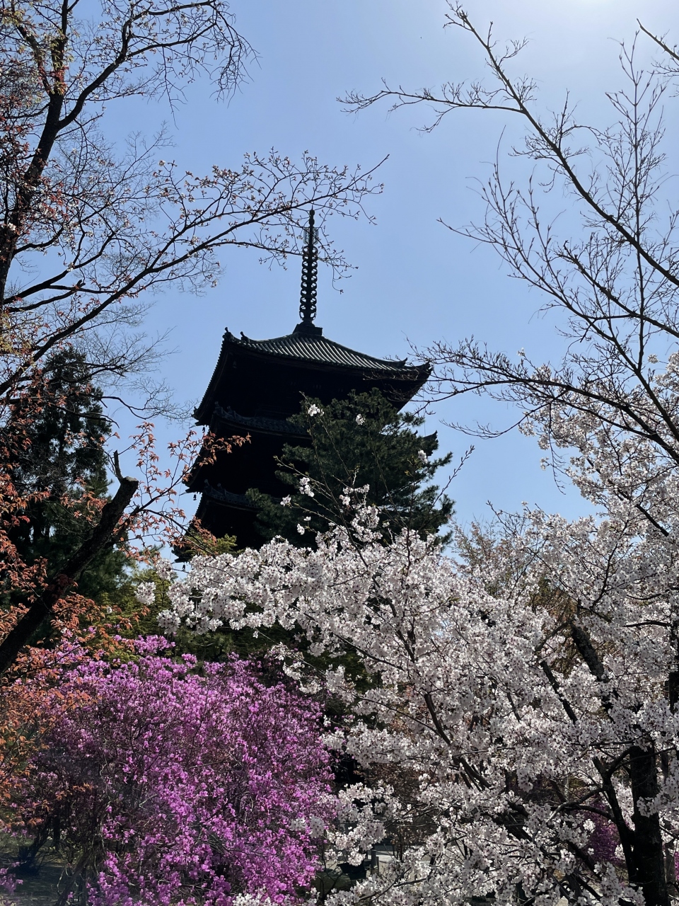 桜を見るツアーに参加して、仁和寺にも立ち寄りました。御室桜は2分咲きでしたが、8分ほど咲いている木もあり、可愛らしい丸い花びらの桜を楽しむ事ができました。御室桜だけでなく、ほかの桜やつつじも咲いており、花越しに見る五重塔は風情がありました。