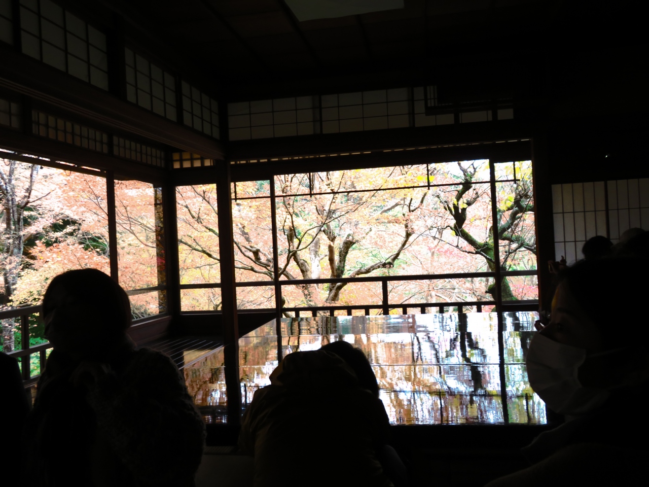 黒塗りの机の鉄板に反射した紅葉を撮る為に多くの人が集まりとても密でした。