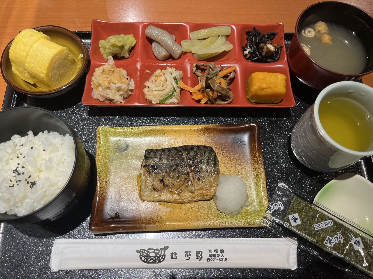 もともと錦市場で朝営業しているお店は少ないところ、コロナ禍で時短営業に切り替えているお店もあるので、朝営業している貴重なお店でした。だし巻き卵を扱うお店のようですが、イートインスペースでは和定食の朝ご飯がいただけます。メインを肉か魚か選ぶスタイルで940円でした。作り置きのメニューが多く、ビジネスホテルの朝ご飯っといった感じのお店でした。