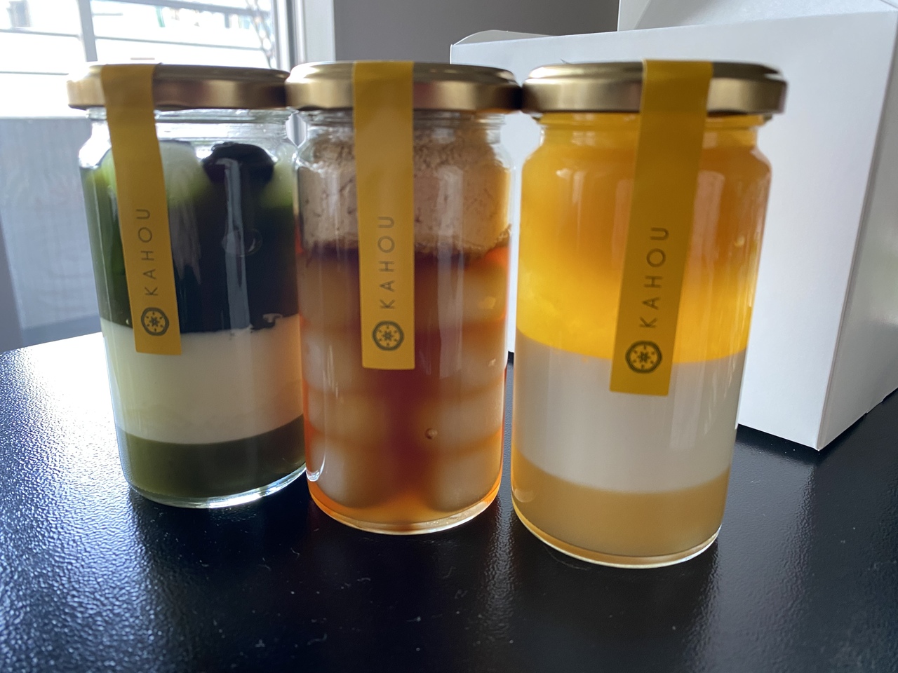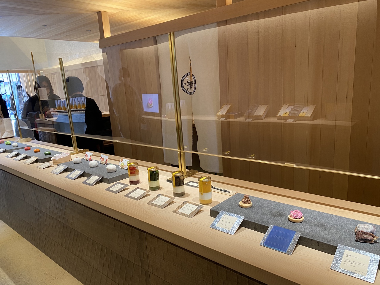 長いカウンターに商品サンプルが綺麗に並べてあります。団子の瓶詰めが斬新でめをひきました。和菓子なのに洋菓子のようにも見えます。