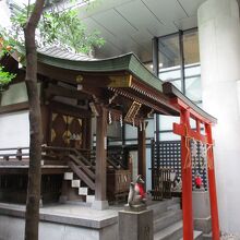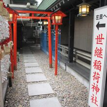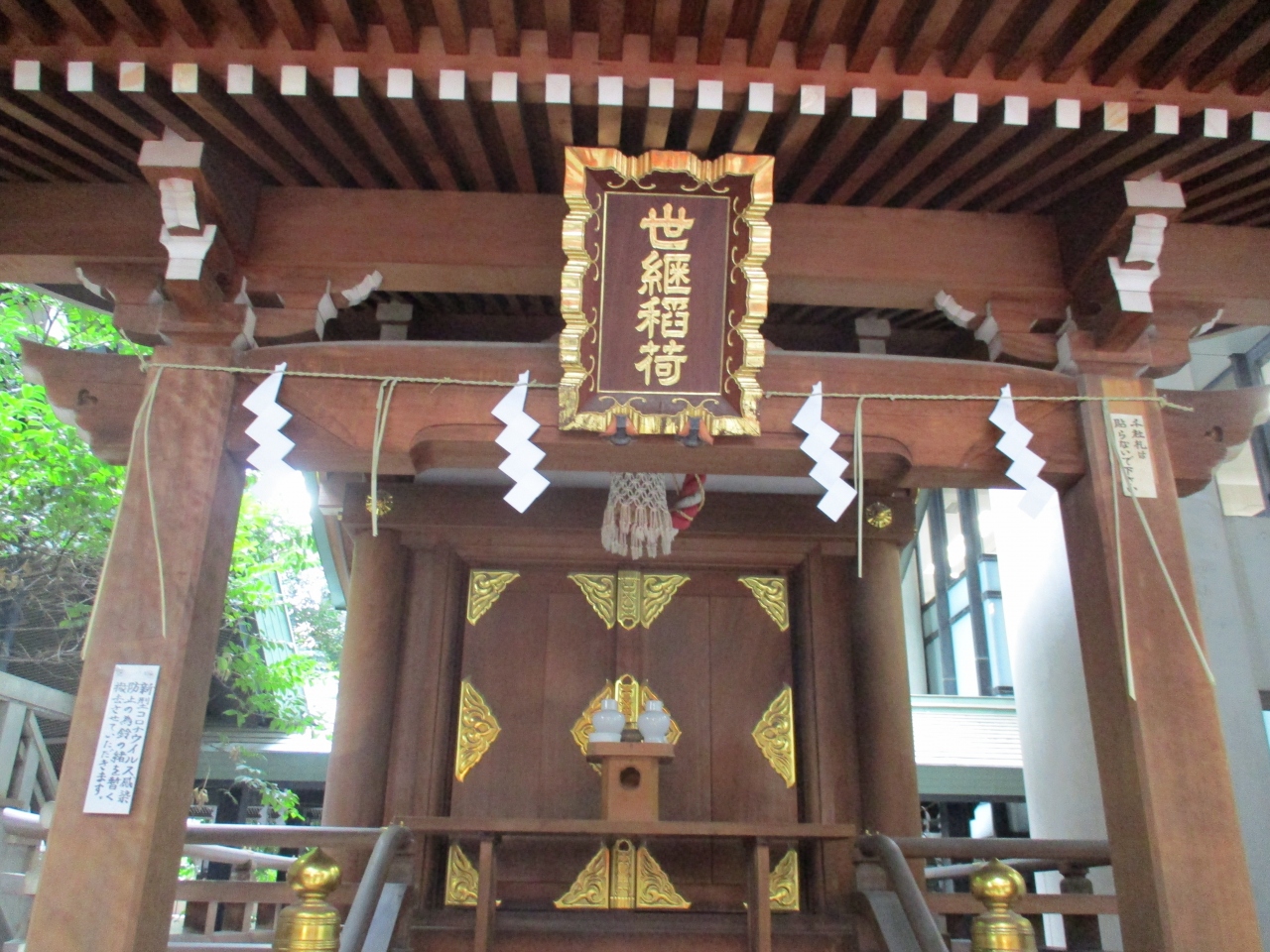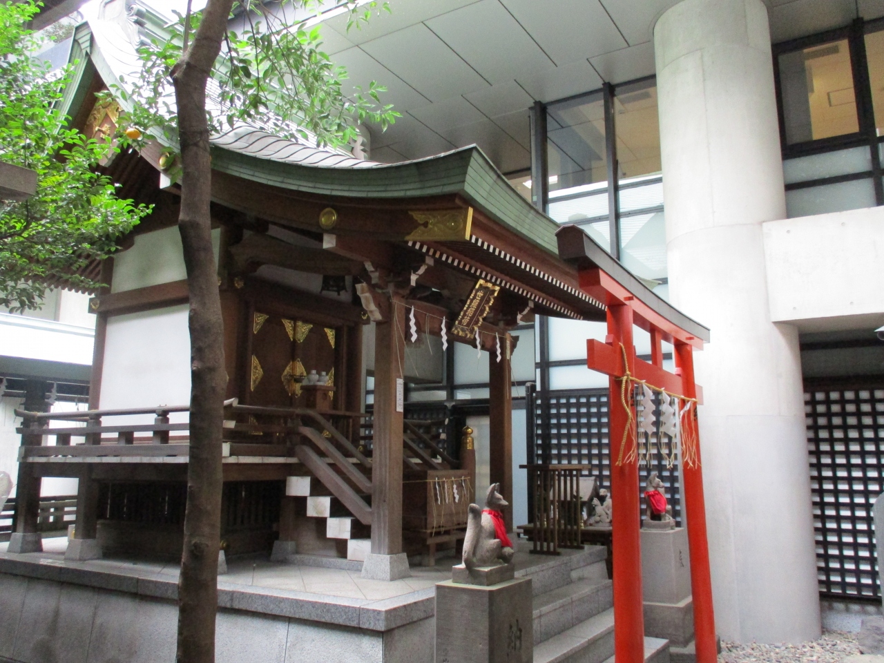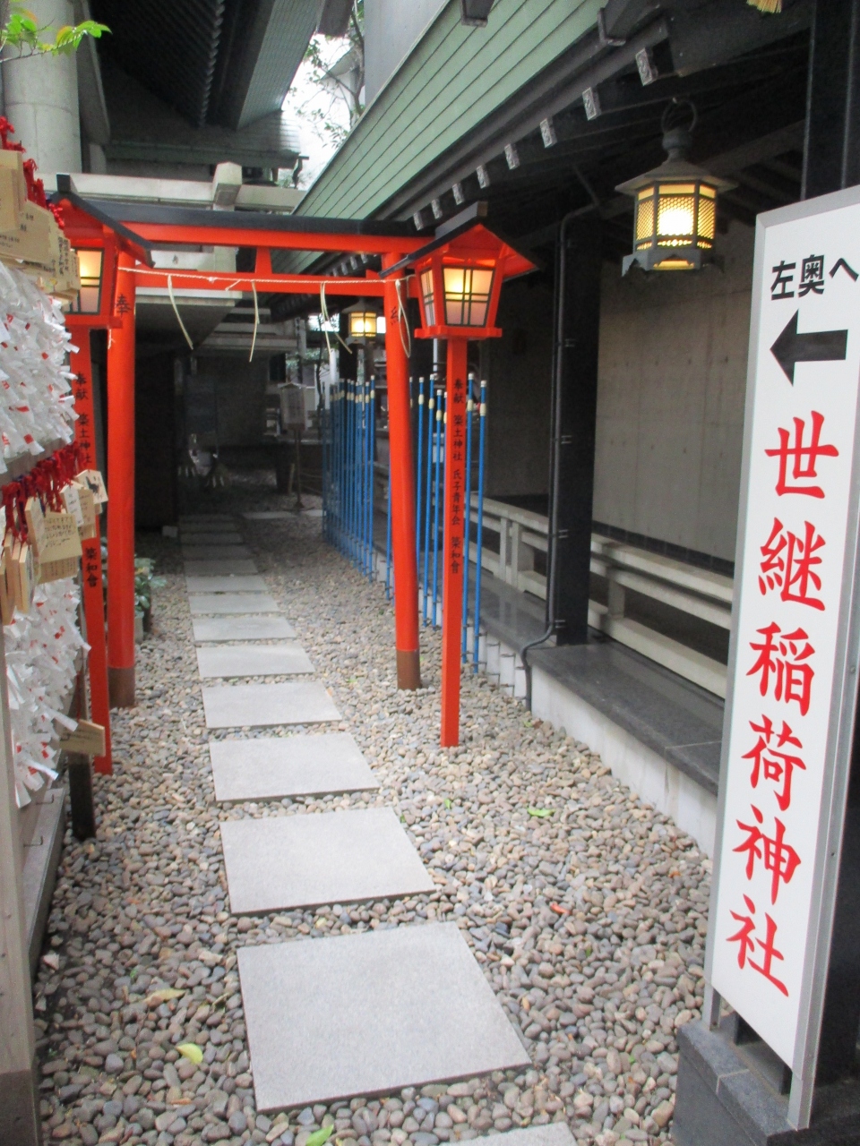 九段北にある築士神社に立ち寄った時に、神社の境内の奥に稲荷神社がありました。築士神社の社殿の裏側にあるので、案内板がなければ気が付くことができない奥まった場所にある稲荷神社です。建物と建物の間に挟まれていて、よくこんな場所にお社を建てることができたと思わず感心してしまいました。