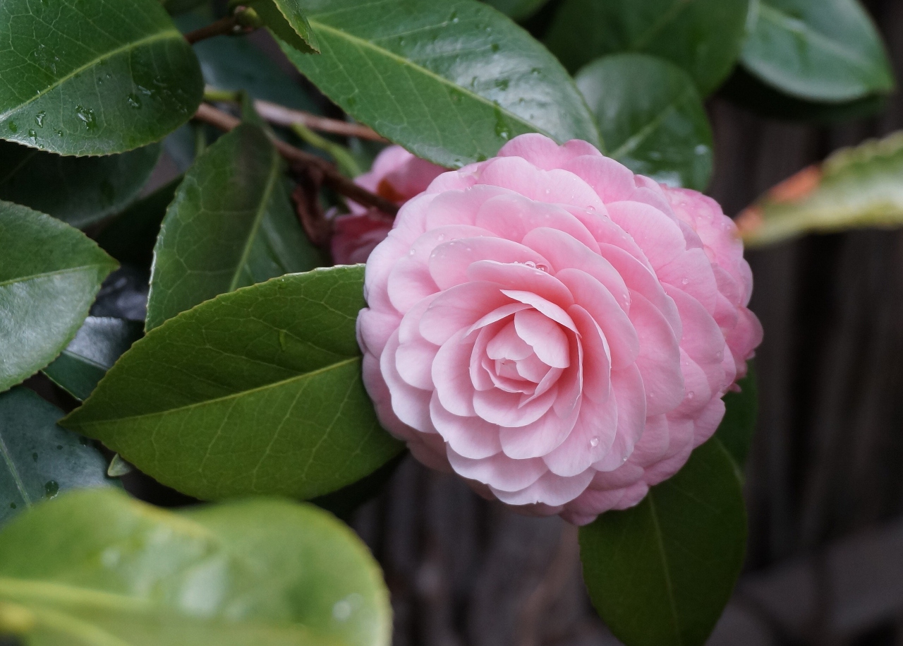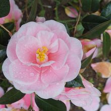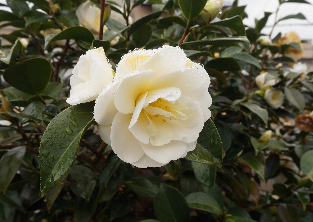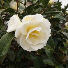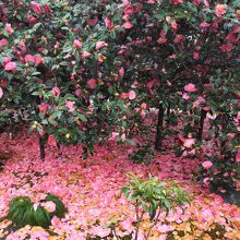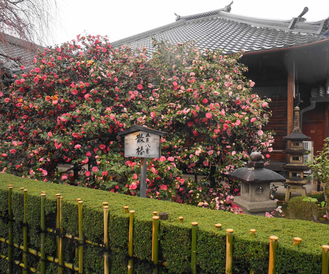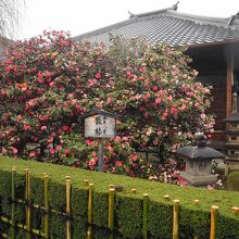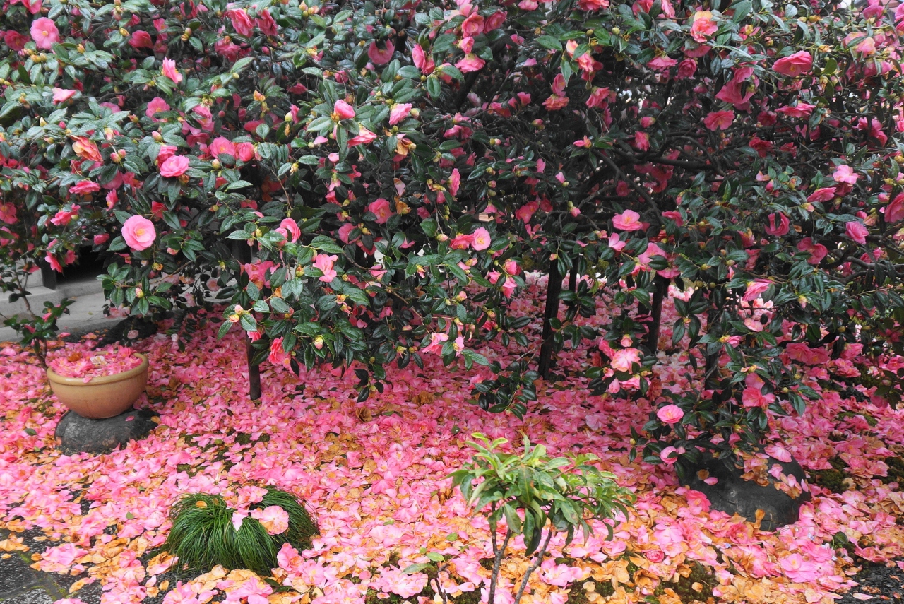 例年3月下旬頃に見頃を迎える五色八重散椿は、1本の木に濃淡様々な色合いの花が見られる名木です。