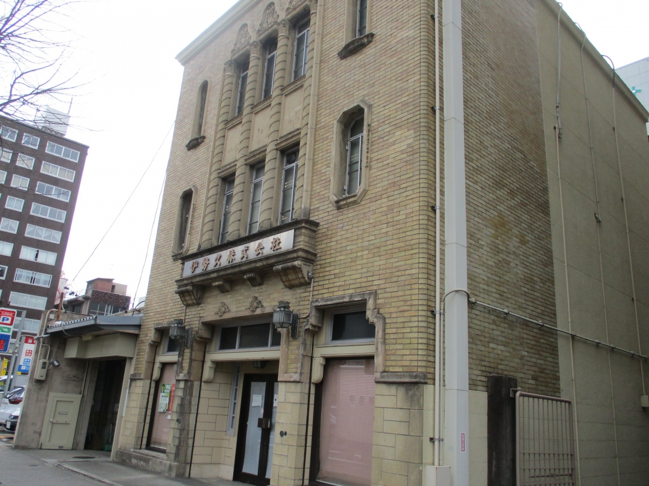 大津橋交差点の南に二つレトロなビルがあります。南側にあるのが伊勢久株式会社の本社家屋です。1758年に薬舗を開業、1930年に伊勢久商店を設立。現在臨床検査薬、医療機器、器具などの会社です。レンガ造りで重厚感があります。窓のまわりにらせん状のデザインがついていておしゃれです。