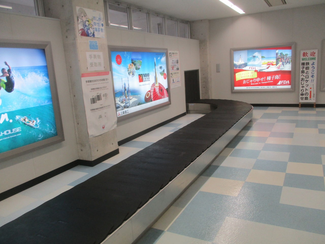 種子島空港の到着階に観光地を紹介した絵が飾られていました。成田、羽田の到着エリアもそうですが、各地の空港の到着階は見過ごしそうですが、こういった観光アピールをしています。帰りは見ることができないので、貴重な光景でした。種子島滞在時に訪れる予定の種子島宇宙センター、宇宙科学技術館、千座の岩屋の写真があり、思わず期待度が増しました。