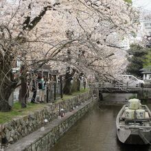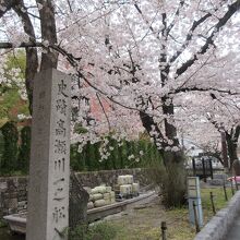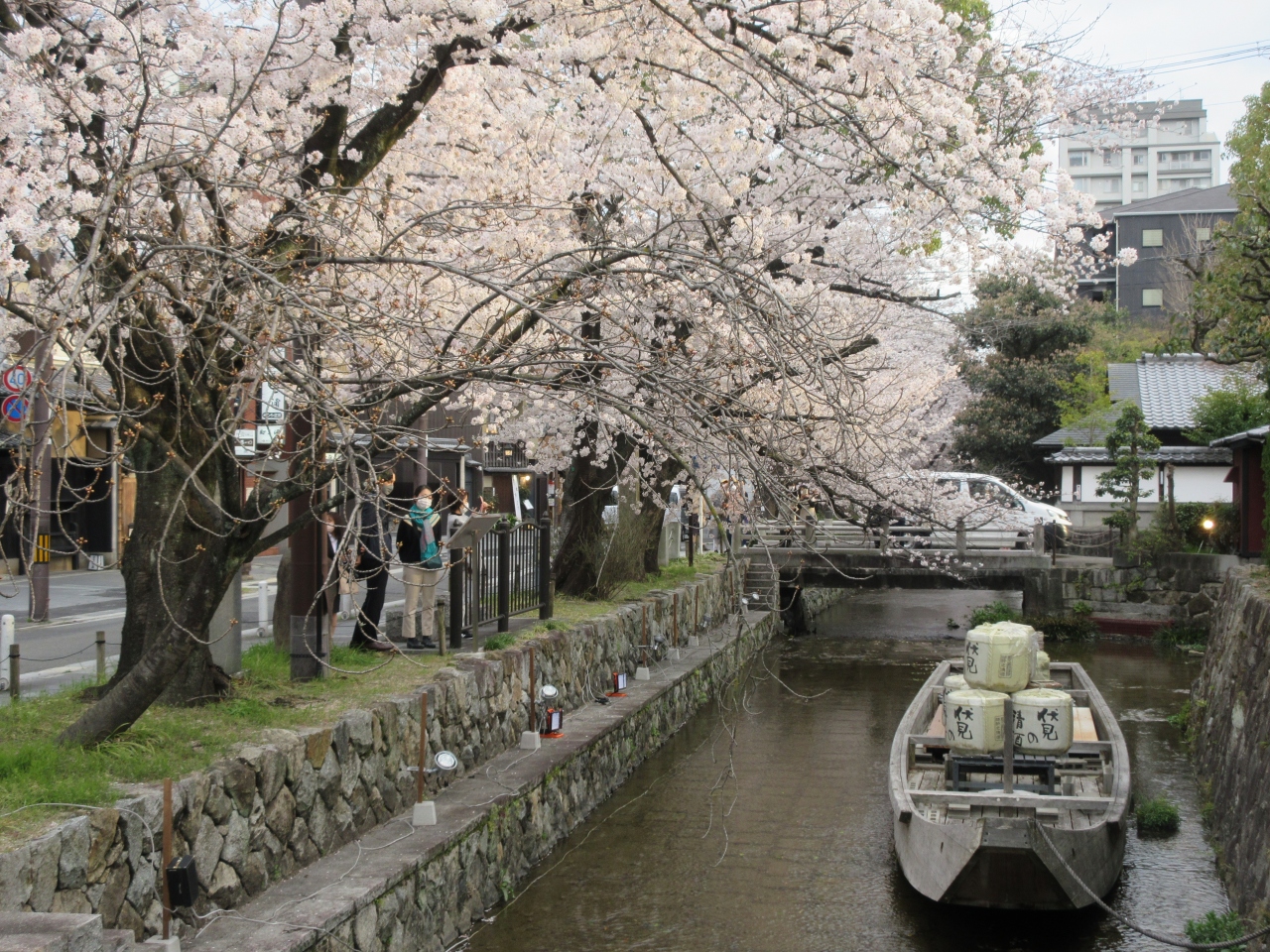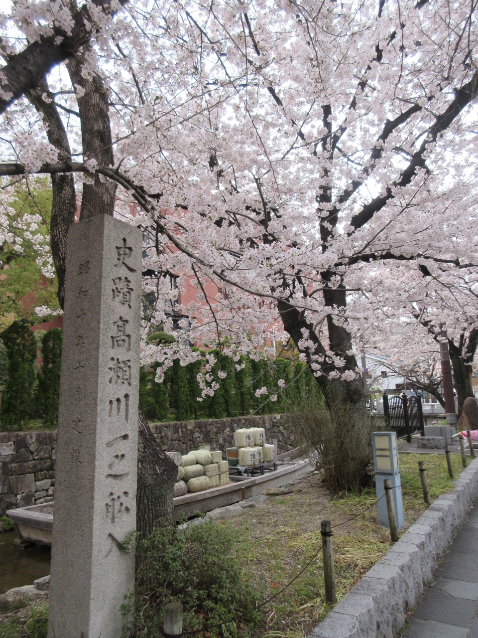桜並木が美しい高瀬川沿い、御池橋と二条通の間の植え込みに碑と説明板が建っています。伏見を通じて大阪から物資を運び入れていた高瀬舟が、荷物の積み下ろしや船の方向転換を行っていた場所だったそうです。かつて船入は9か所あったそうですが、現在の場所を除き埋め立てられてしまったとのことです。現在は桜並木と川の中に酒樽の乗せた船が一艘浮かび、趣ある風情を醸し出しています。