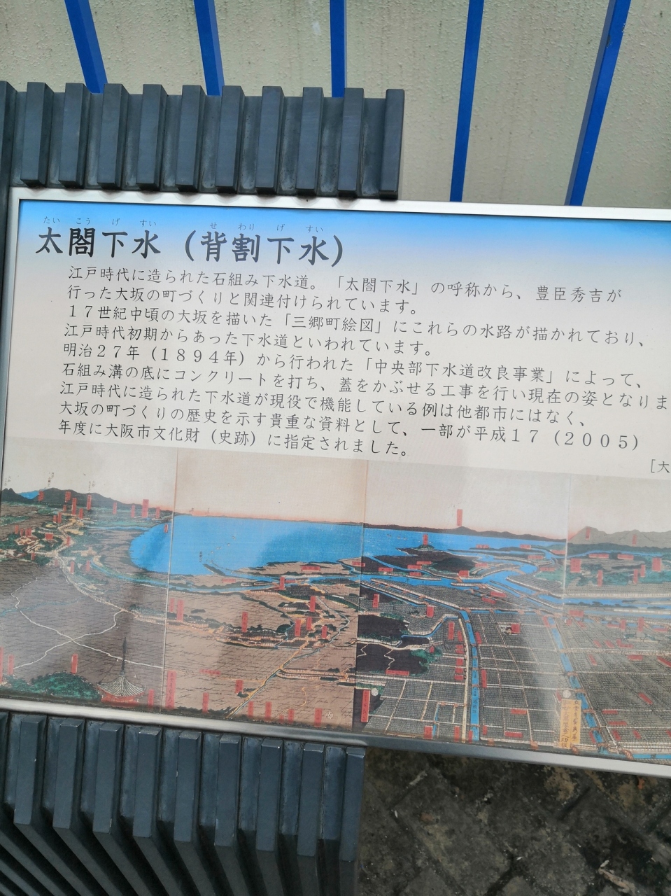谷町四丁目近くの南大江小学校の前にあります。太閤という名の通り、豊臣秀吉による大坂城築城の時に建設された石積の下水溝です。路上にあるのはのぞき窓でそこからならいつでも見学できますが、地下を見学するにはさすがに申し込みがいるようです。