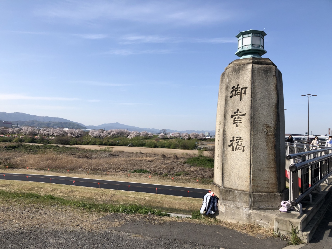 淀川本流である宇治川に架けられた全長約266mの淀川御幸橋と木津川に架けられた全長約355mの木津川御幸橋から構成されています。御幸橋には京都府道13号京都守口線が通じていて交通通量が多い。「背割堤さくらまつり」を見学するのに京阪・石清水八幡宮駅から歩いて行きました。歩道は広くて歩きやすかったけど、思っていた以上に長くて遠い。