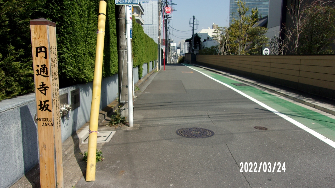 この円通寺坂は青山通りからのぼる薬研坂を坂上あたりから赤坂一ツ木通りに下る坂です。地下鉄東京メトロ千代田線赤坂駅から北側のエリアです。駅からは10分程度です。この坂は途中に名前の由来になった円通寺があります。坂の上のエリアは寺院があるのです。下っていくと今は一ツ木通り商店街になるので飲食店などが並んでいます。坂の上と下では雰囲気がまるで違うのです。