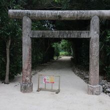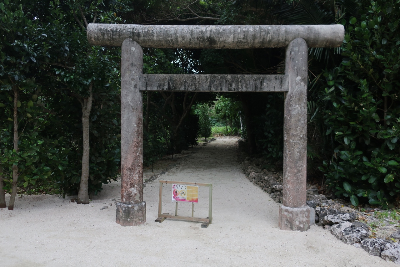 ンブフルのある坂道を登って島の中央の小高い丘を越えて反対側の集落に入るとすぐに鳥居が見えてきます。カイジ浜に向かう途中にこの集落を通り過ぎて、入り口の鳥居だけ見ました。もちろんここも一般観光客は立ち入り禁止です。