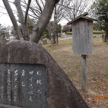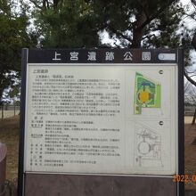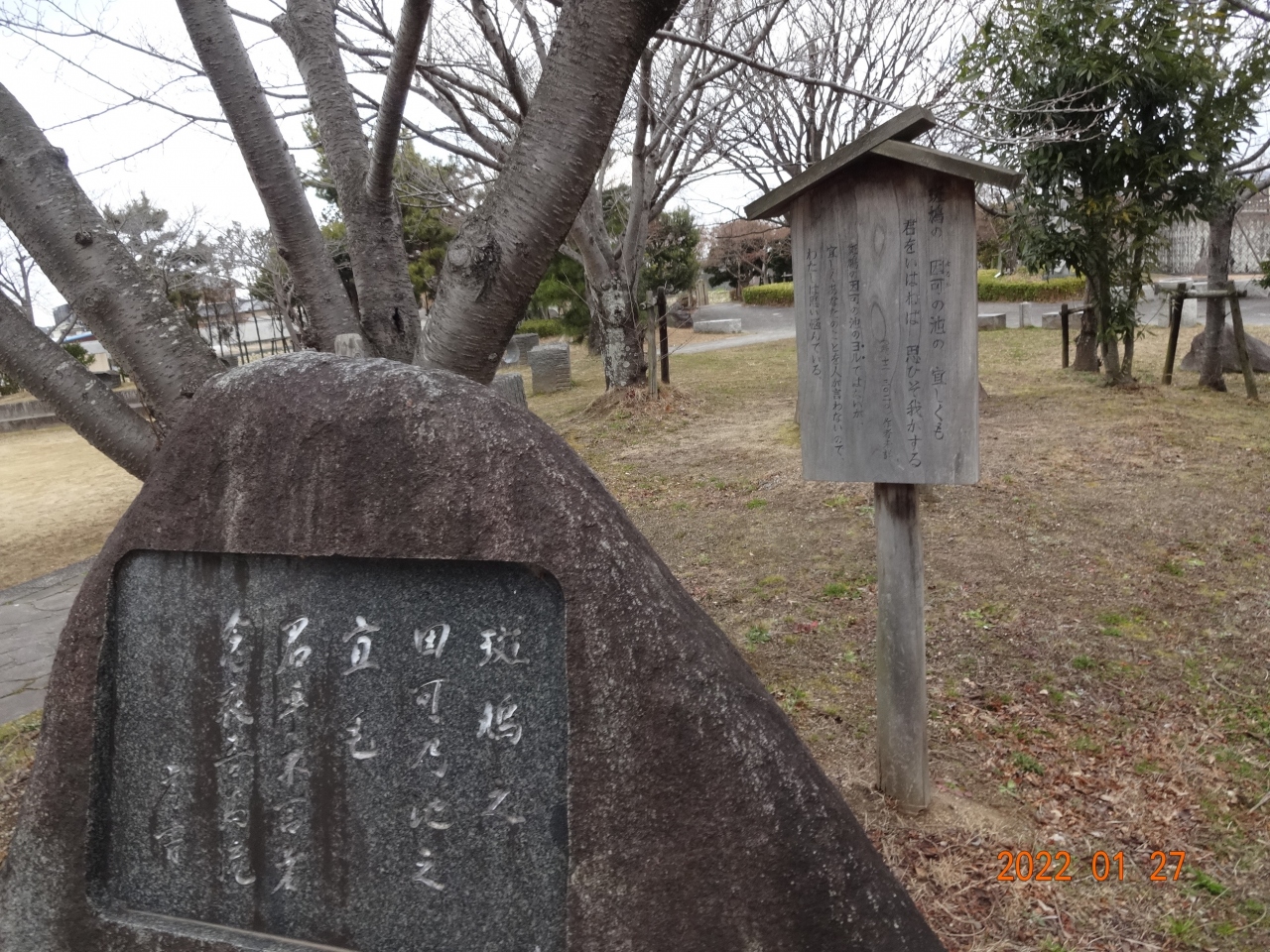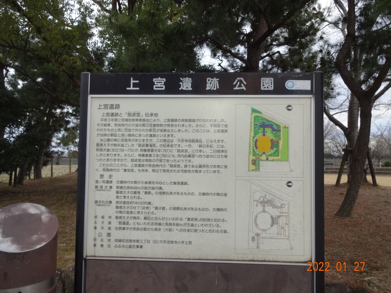 小さな女の子と母親が公園内で遊んでいました。公園内で見かけたのは、その一組だけです。雰囲気の良い公園です。この場所は、称徳天皇が行幸した際に利用されたとされる行宮の「飽波宮」と考えられ、地下遺構の保存に配慮する形で公園が建設されたそうです。