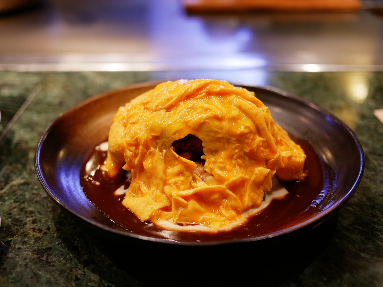 ライスの上に、鉄板でソテーされたハンバーグをトッピングし、周りには、チーズとデミグラスのダブルソースを回しかけて、最後に、トップに小さなフライパンで作ったオムレツをオンしています。